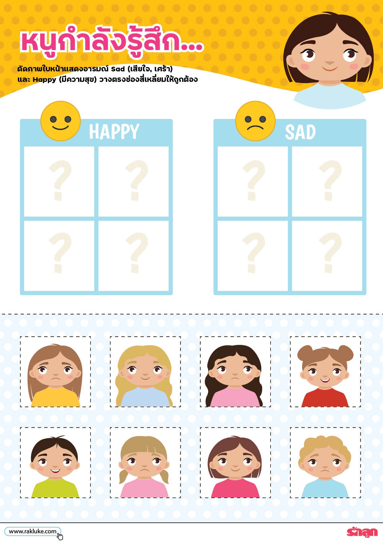 - ตัดภาพใบหน้าแสดงอารมณ์ Sad (เสียใจ, เศร้า) และ Happy (มีความสุข) วางตรงช่องสี่เหลี่ยมให้ถูกต้อง