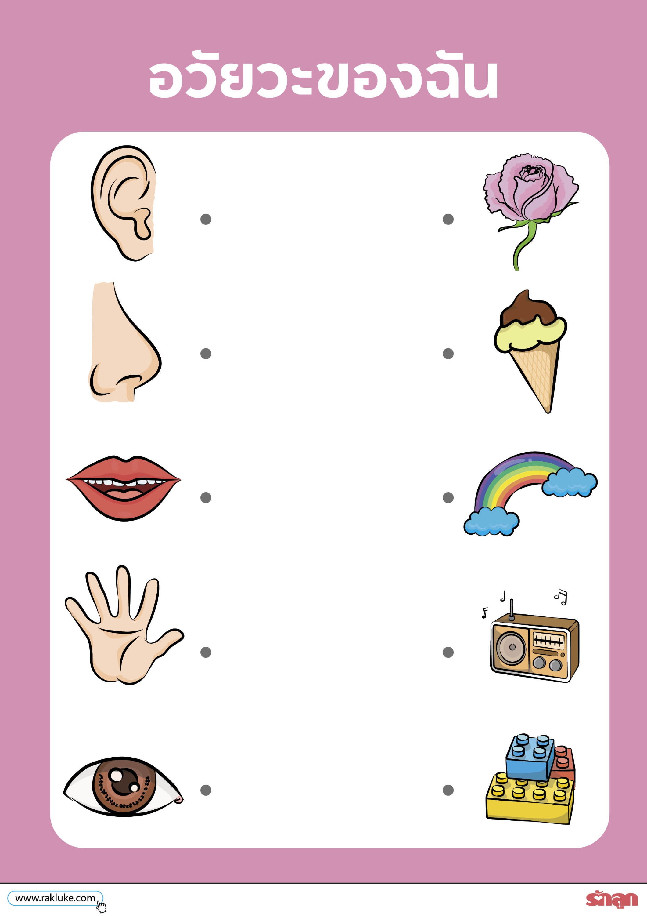 ลองดูภาพอวัยวะ และ ภาพสิ่งต่างๆ ในรูป แล้วลองคิดว่าอวัยวะต่าง ๆ ทำหน้าที่อะไรได้บ้างนะ และ บอกเหตุผลตามความคิดของเด็ก ๆ (คำตอบอาจไม่ได้มีคำตอบเดียว)