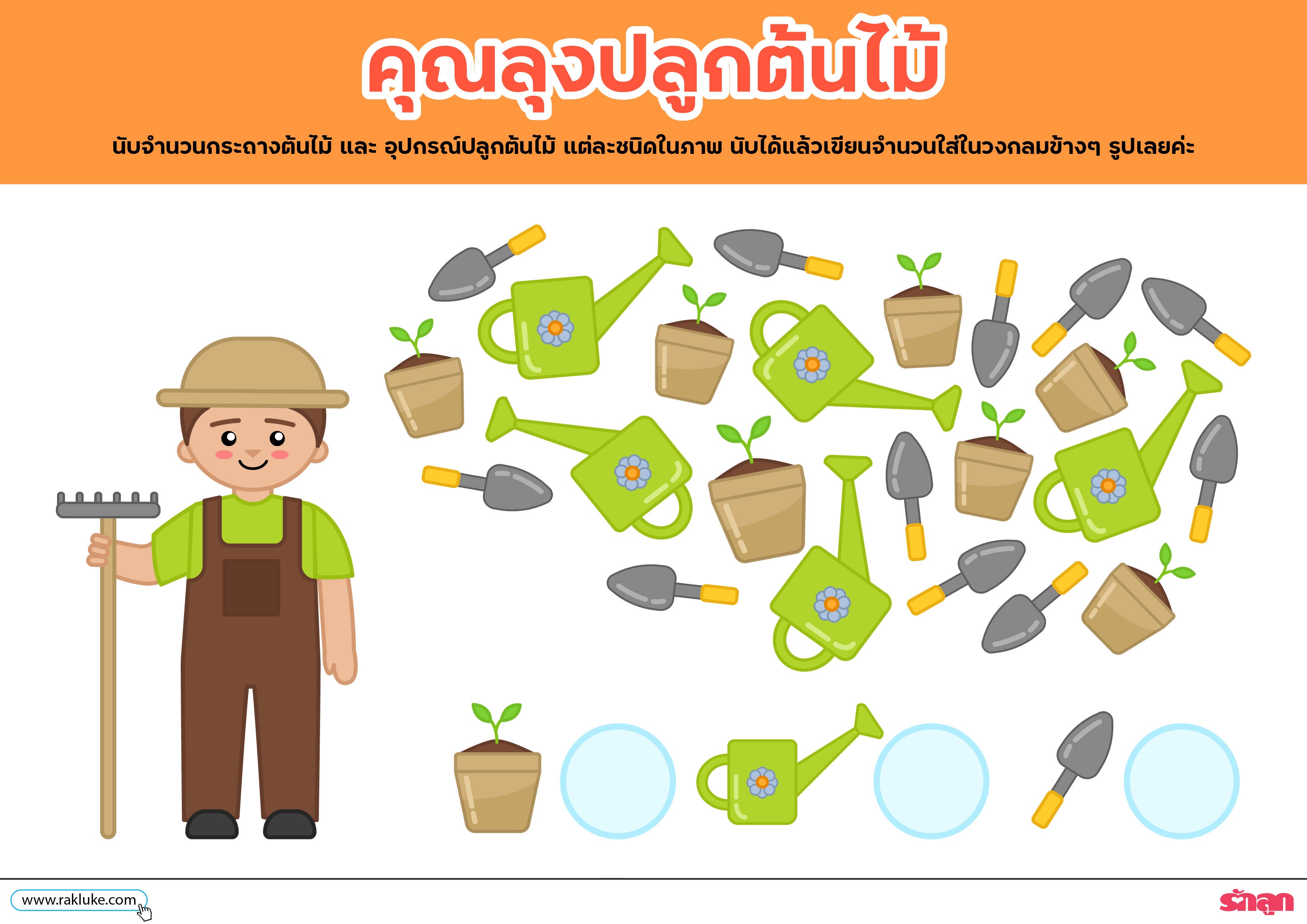 - นับจำนวนกระถางต้นไม้ และ อุปกรณ์ปลูกต้นไม้ แต่ละชนิดในภาพ นับได้แล้วเขียนจำนวนใส่ในวงกลมข้างๆ รูปเลยค่ะ