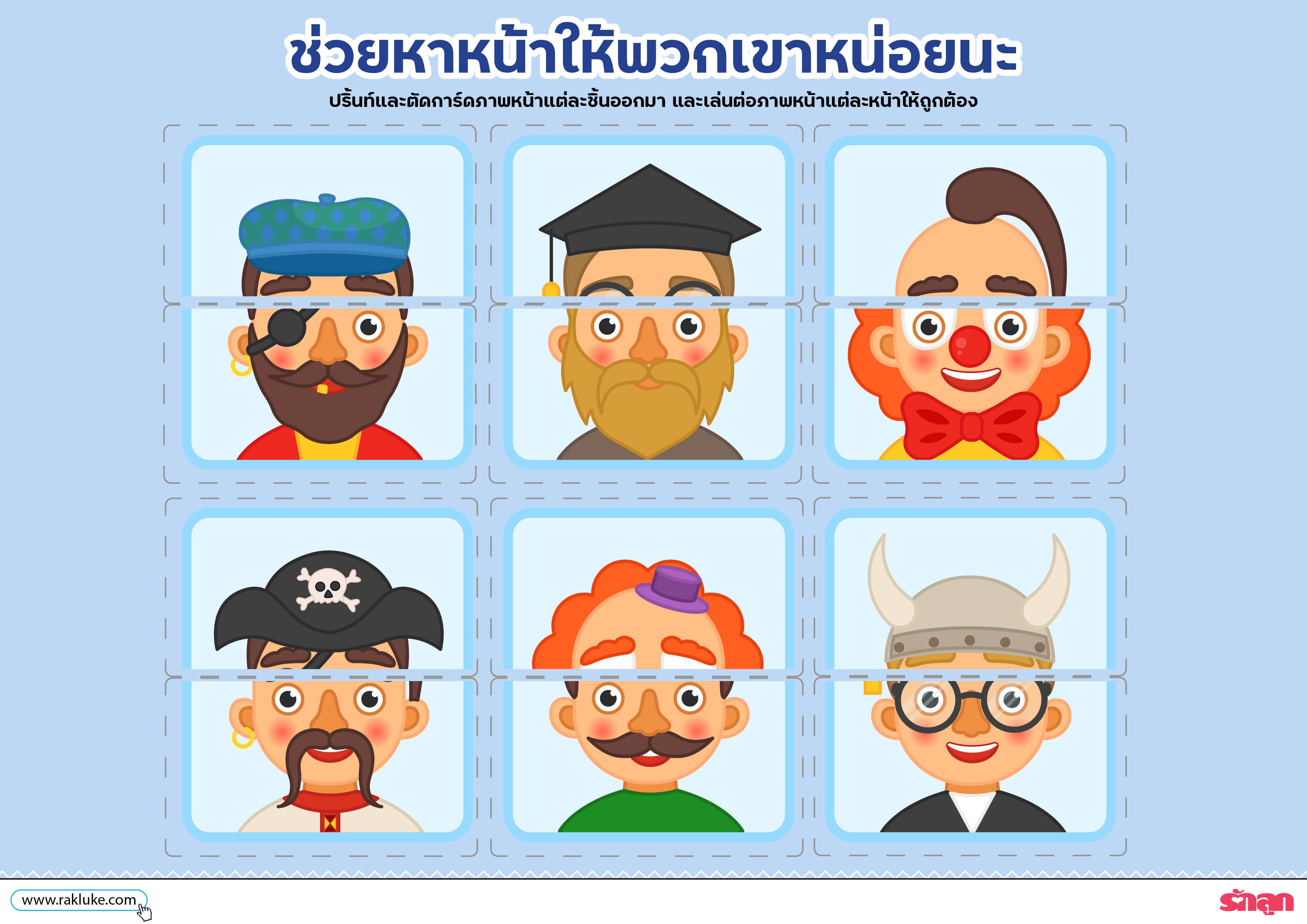 - ปริ้นท์และตัดการ์ดภาพหน้าแต่ละชิ้นออกมา และเล่นต่อภาพหน้าแต่ละหน้าให้ถูกต้อง