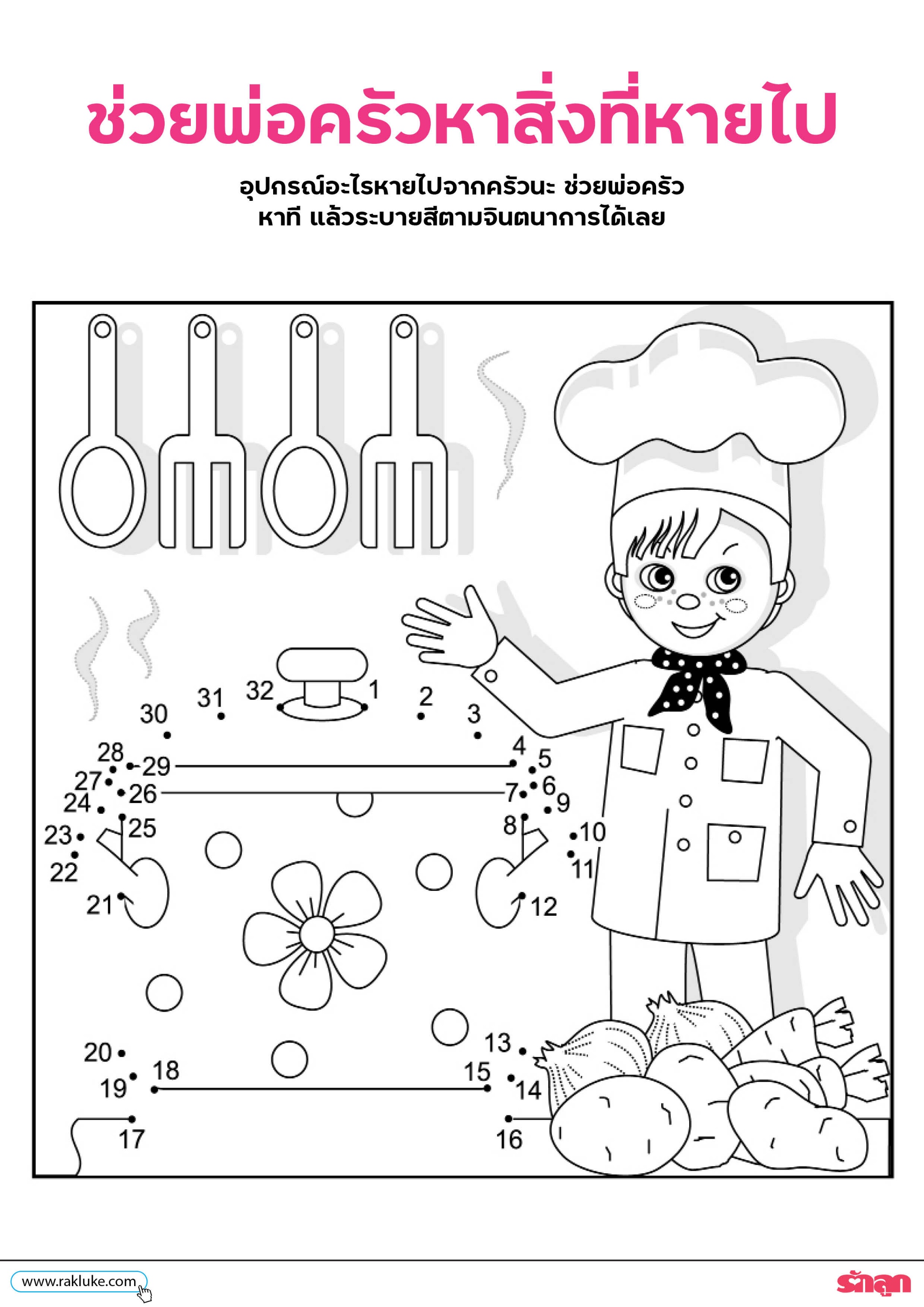 - เด็กลองทายดูว่าอุปกรณ์อะไรหายไปจากครัว แล้วช่วยพ่อครัวตามหา ลากเส้นต่อระหว่างตัวเลขตามลำดับ แล้วระบายสีภาพตามจินตนาการของเด็กๆ ได้เลย