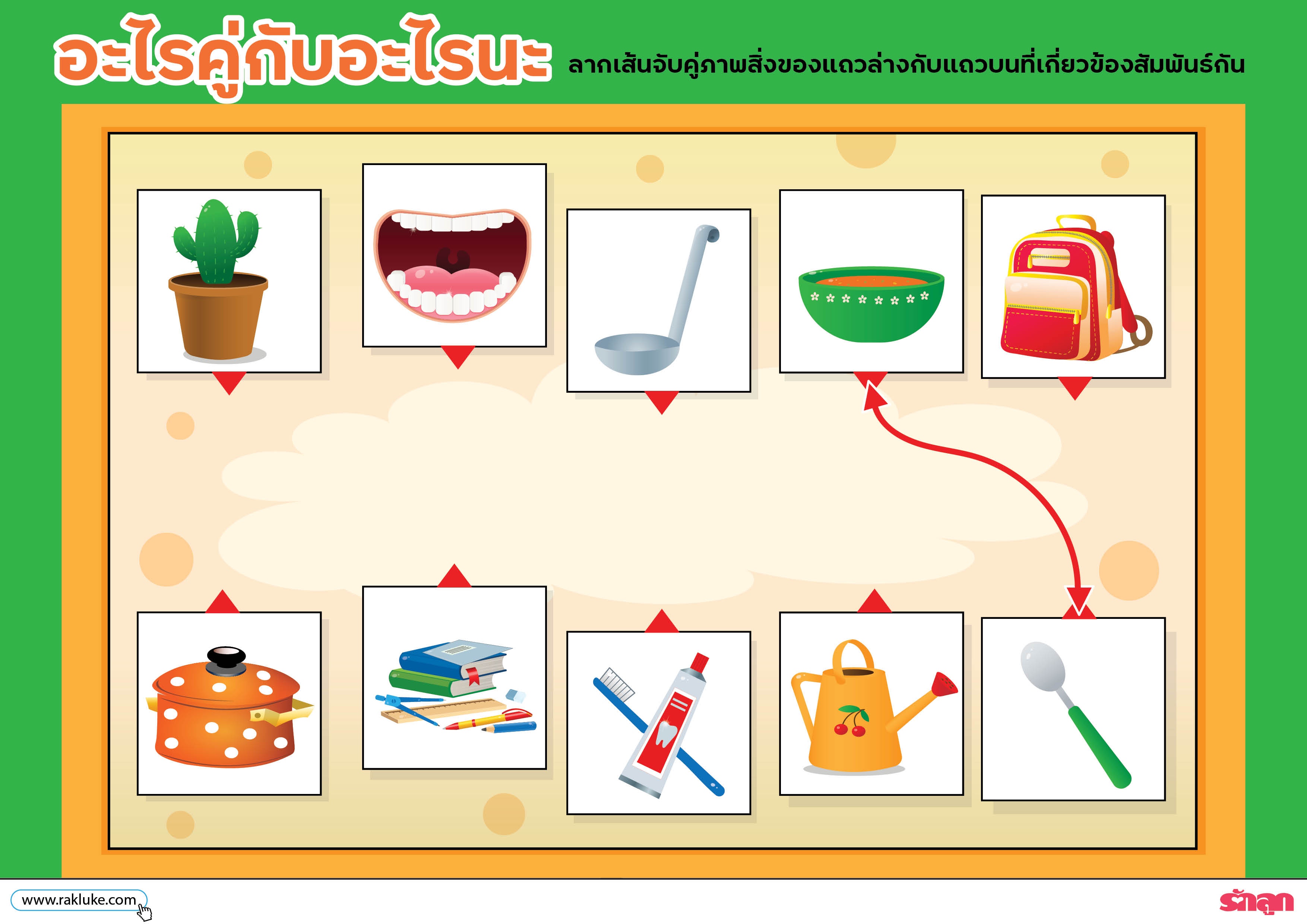 - ลากเส้นจับคู่ภาพสิ่งของแถวล่างกับแถวบนที่เกี่ยวข้องสัมพันธ์กัน