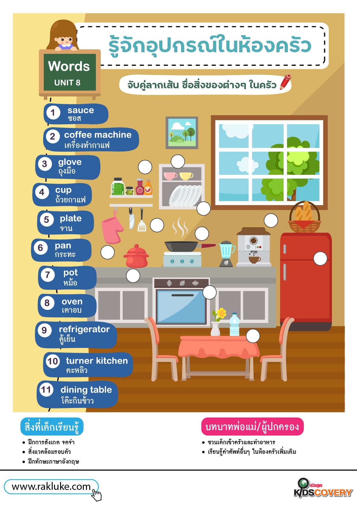 - จับคู่ลากเส้น คำศัพท์กับสิ่งของต่างๆ ในครัวให้ถูกต้อง