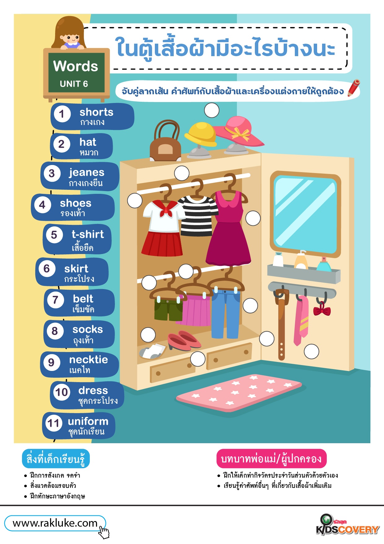 - จับคู่ลากเส้น คำศัพท์กับเสื้อผ้าและเครื่องแต่งกายให้ถูกต้อง