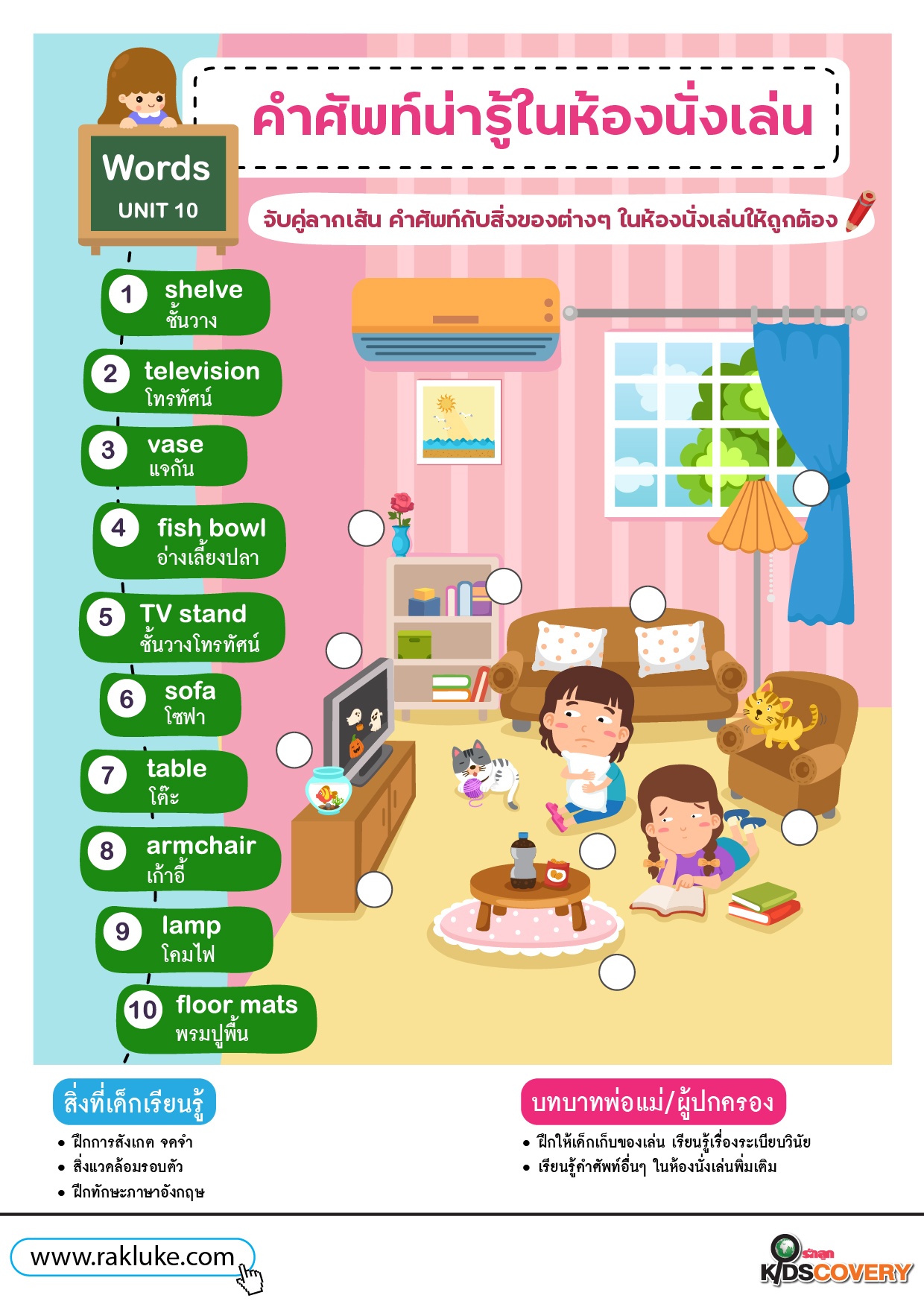 เกมจับคู่ภาพ คำศัพท์น่ารู้ในห้องนั่งเล่น - ดาวน์โหลดฟรี Learning Sheet