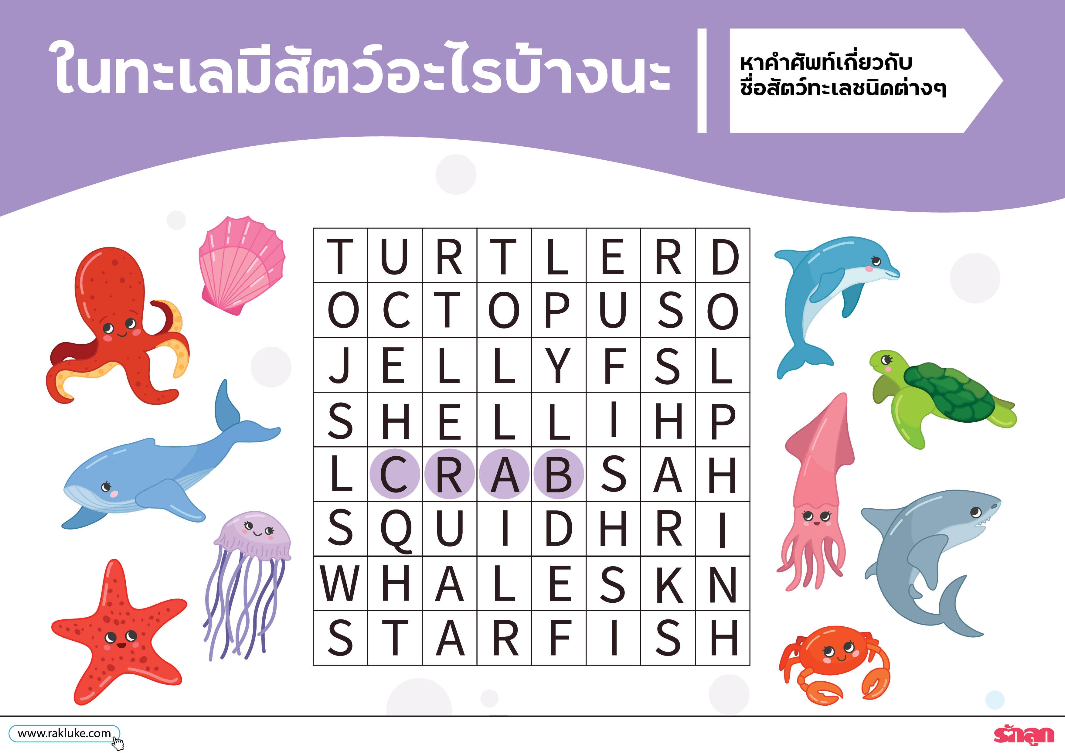 - หาคำศัพท์เกี่ยวกับชื่อสัตว์ทะเลชนิดต่างๆ (ใช้ดินวงหรือสีวงกลมรอบคำศัพย์ใน word puzzle)