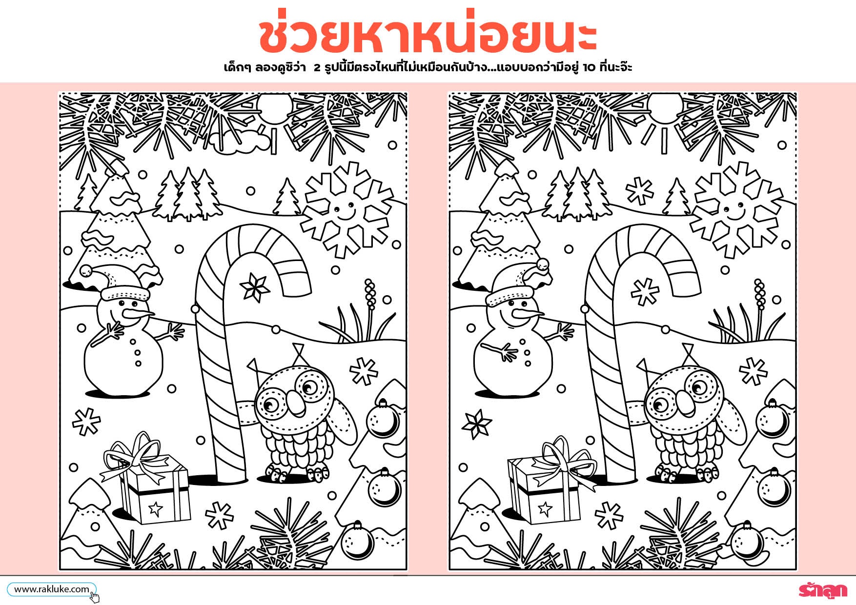 วิธีเล่น: เด็ก ๆ ลองดูซิว่า 2 รูปนี้มีตรงไหนที่ไม่เหมือนกันบ้าง...แอบบอกว่ามีอยู่ 10 ที่นะจ๊ะ หาครบแล้ว ระบายสีเล่นต่อได้เลย