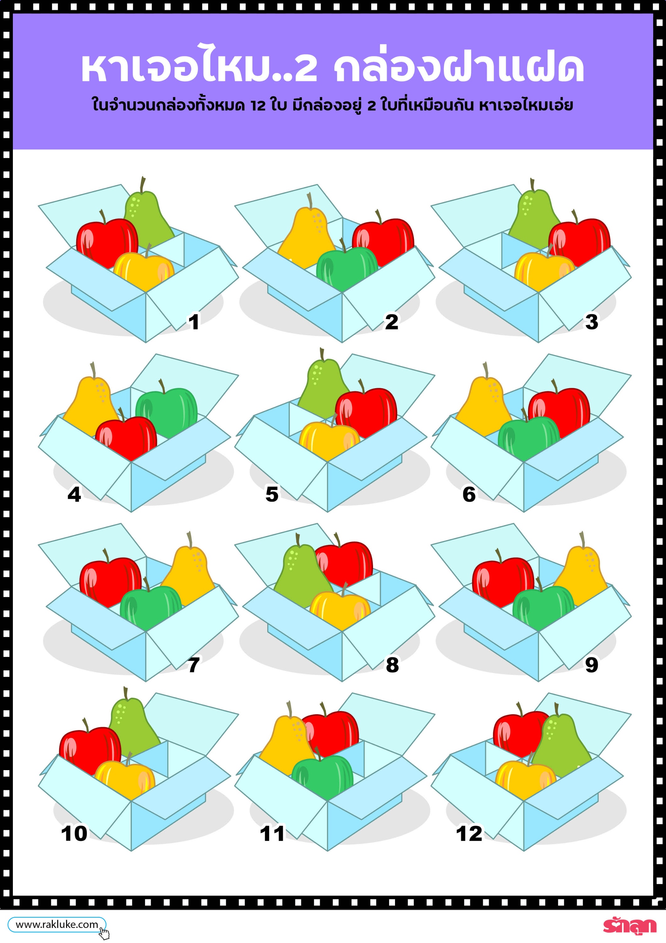 - ในจำนวนกล่องทั้งหมด 12 ใบ มีกล่องอยู่ 2 ใบที่เหมือนกันแบบฝาแฝดเลย หาเจอไหมเอ่ย