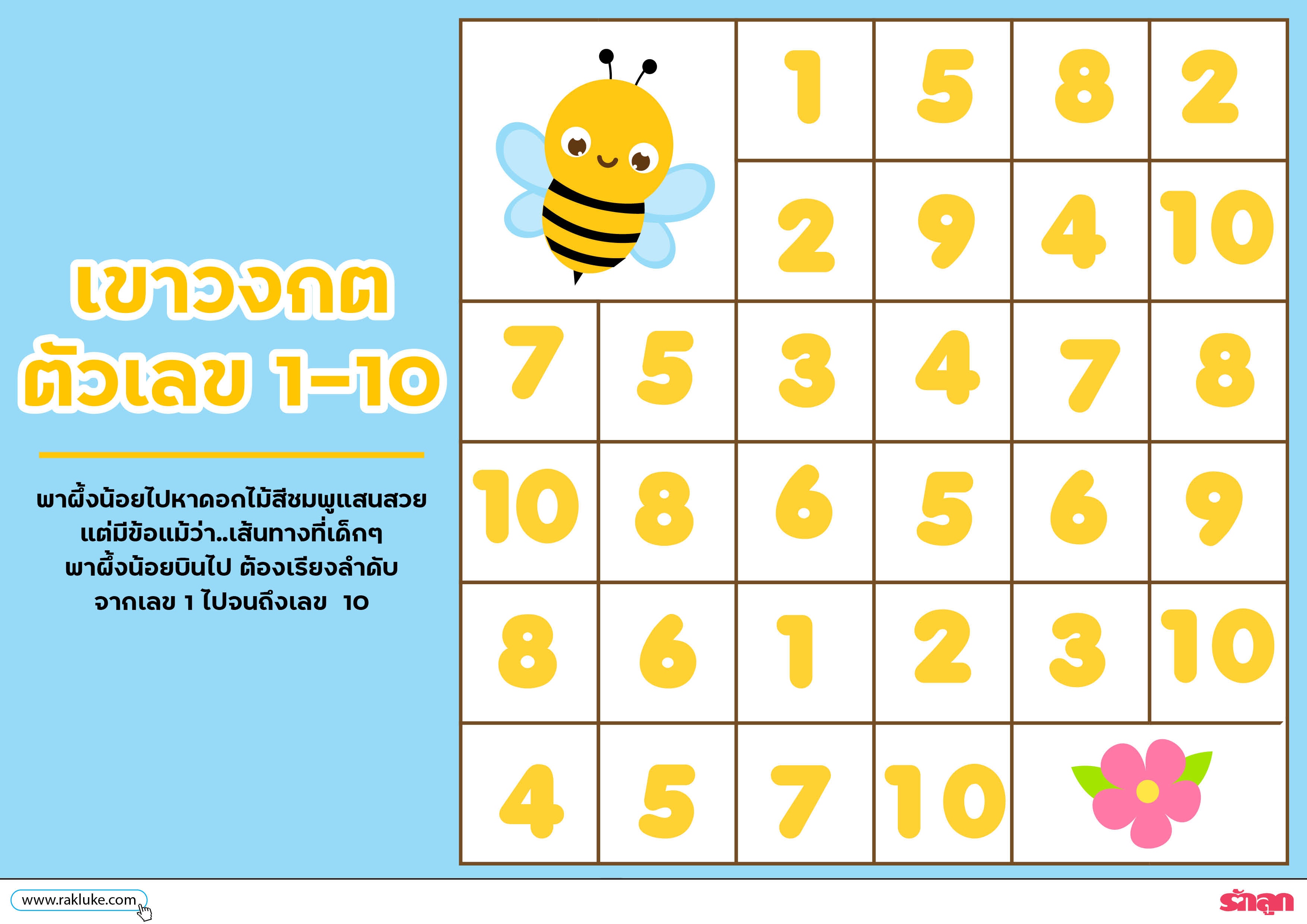 - แต่มีข้อแม้ว่า..เส้นทางที่เด็กๆ พาผึ้งน้อยบินไป ต้องเรียงลำดับจากเลข 1 ไปจนถึงเลข 10 ด้วยนะ ห้ามกระโดดข้ามแม้แต่ตัวเลขเดียว