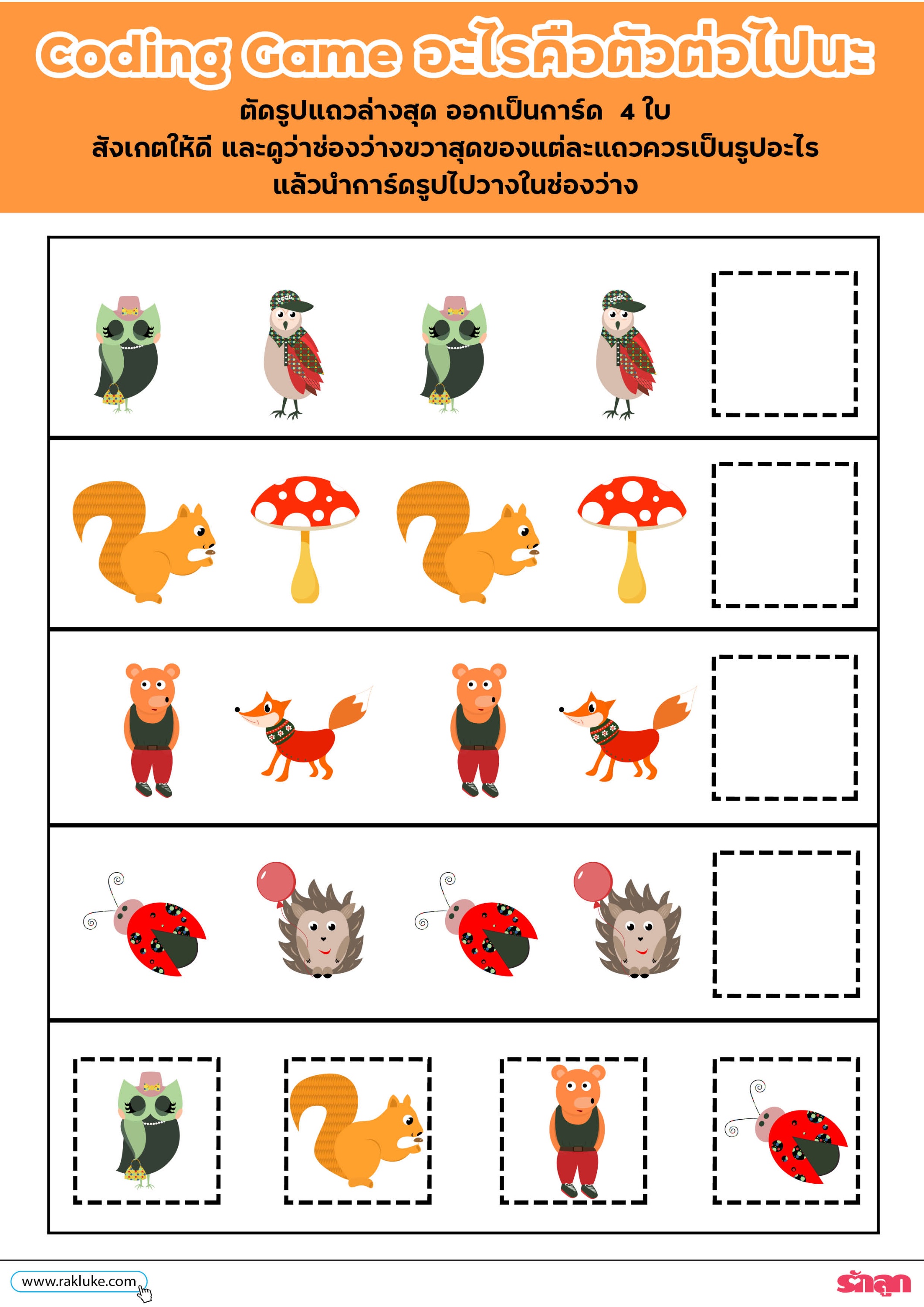 - สังเกตให้ดี และดูว่าช่องว่างขวาสุดของแต่ละแถว ควรเป็นรูป อะไร แล้วนำการ์ดรูปไปวางในช่องว่างเลย