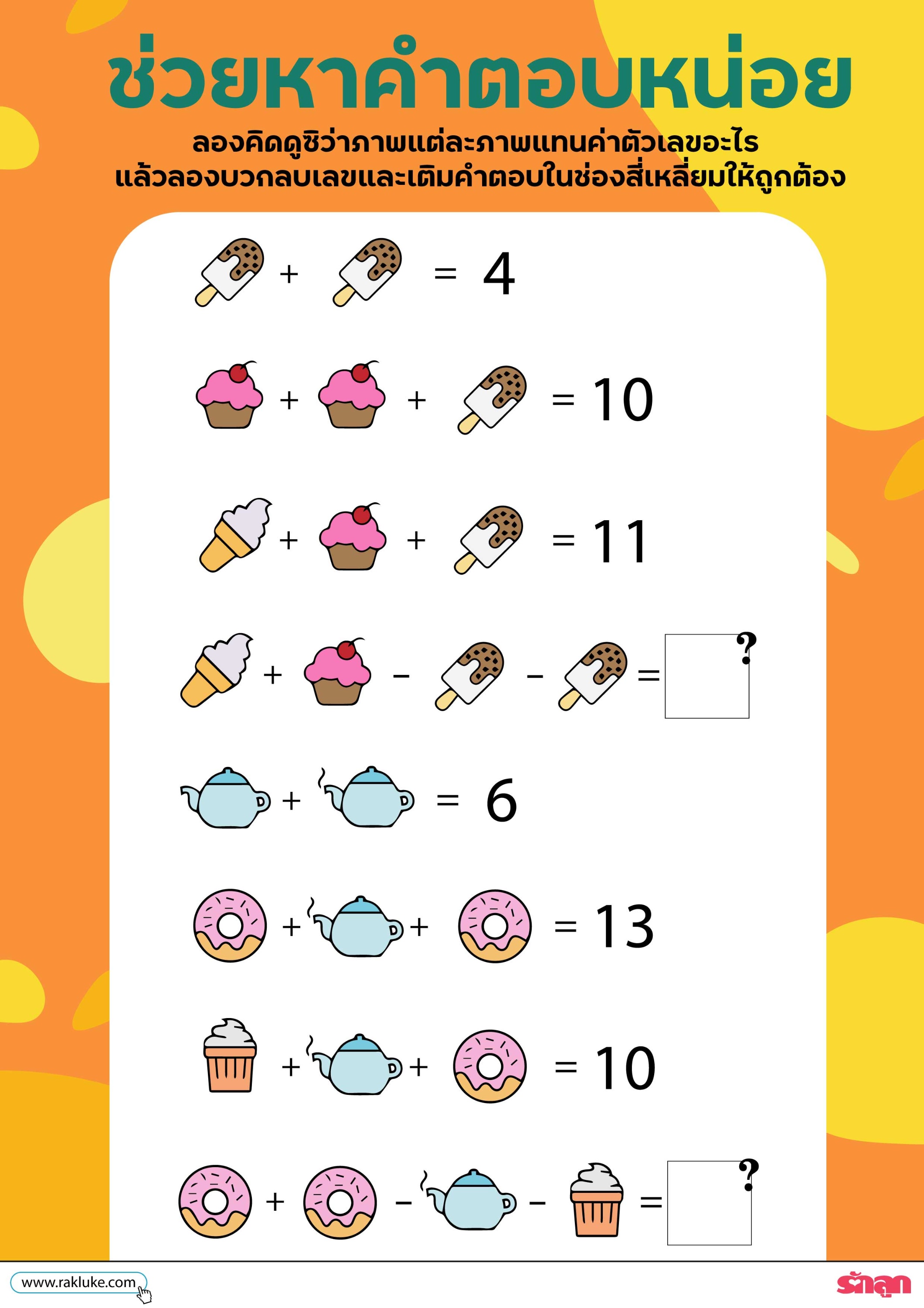 - จากการบวกลบรูปภาพ แล้วได้คำตอบเป็นตัวเลข ลองคิดดูซิว่า ภาพแต่ละภาพ แทนค่าตัวเลขอะไร