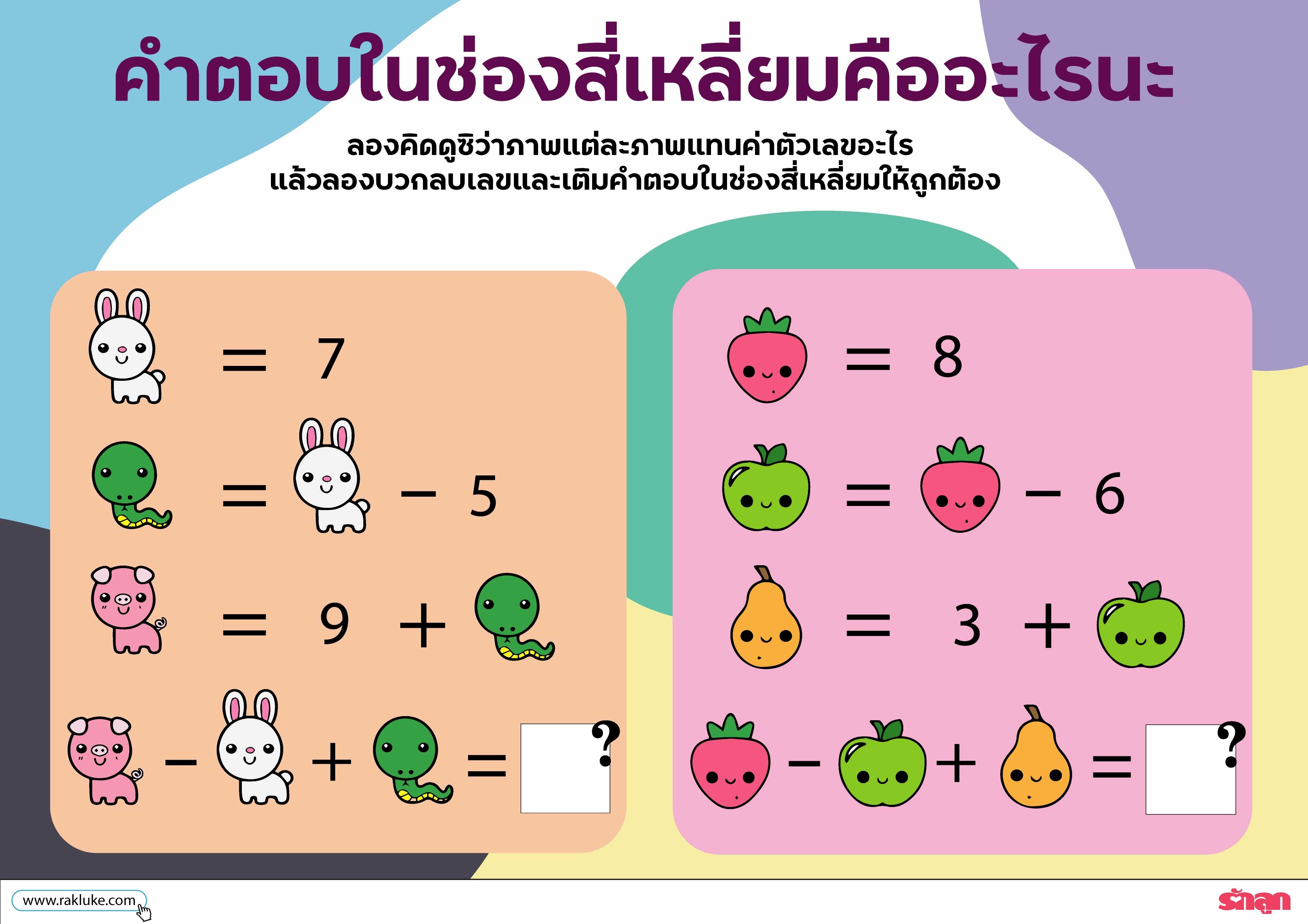 - ถ้าคิดออกแล้ว ก็ลองบวกลบเลขในบรรทัดสุดท้าย แล้วเติมคำตอบในช่องสี่เหลี่ยม