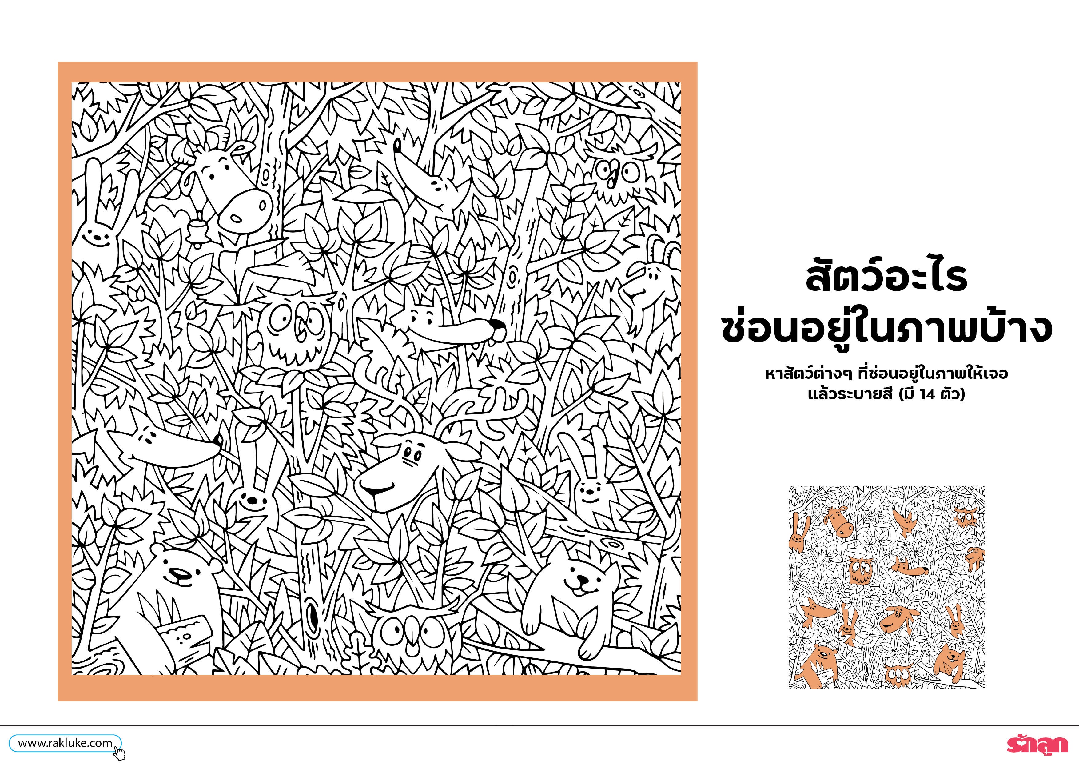 - หาสัตว์ต่างๆ ที่ซ่อนอยู่ในภาพให้เจอ แล้ววงกลมล้อมรอบหรือระบายสีให้ครบ (มี 14 ตัว)