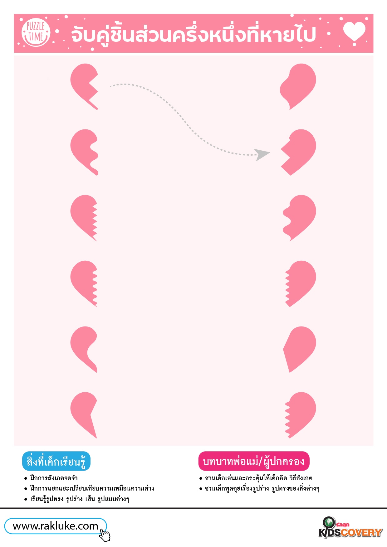 วิธีเล่น: สังเกตชิ้นส่วนในแถวบน และลากเส้นจับคู่กับชิ้นส่วนอีกครึ่งที่อยู่แถวล่าง ที่รวมกันแล้วได้รูปหัวใจพอดี