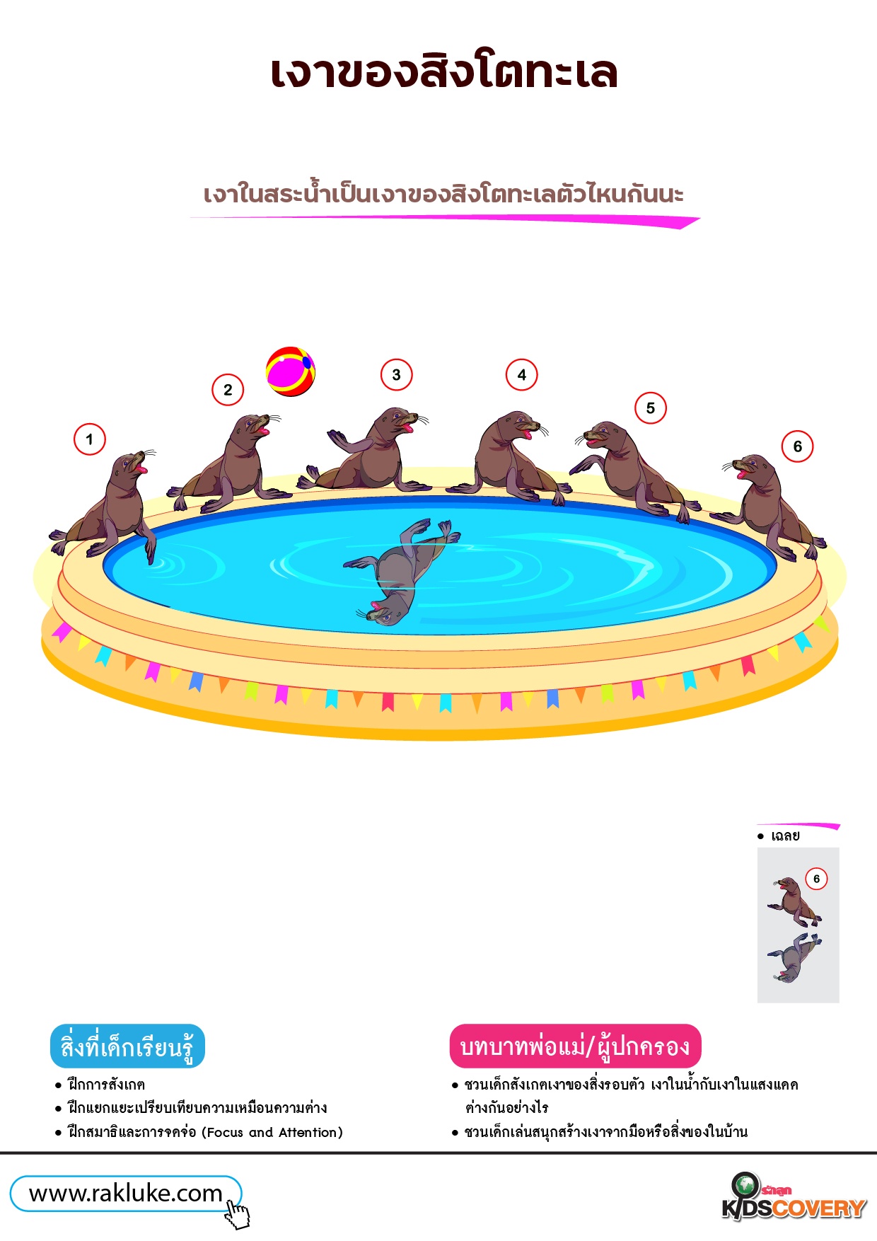 วิธีเล่น: สังเกตรูปร่างของเงาสิงโตทะเลในสระว่าเหมือนรูปร่างของสิงโตทะเลตัวไหน