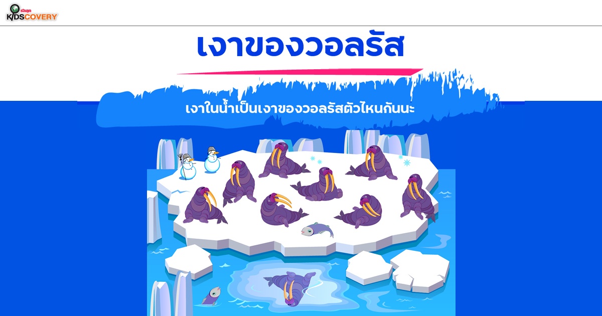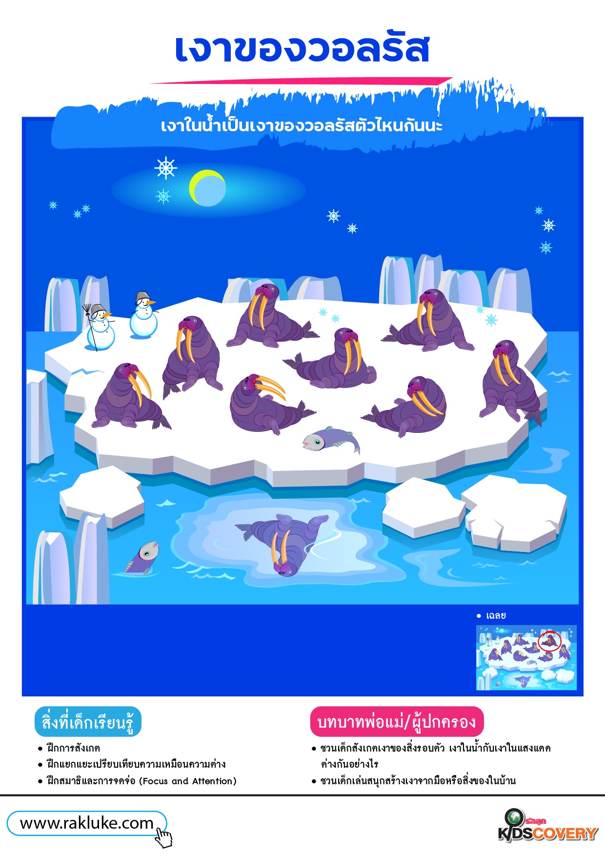 วิธีเล่น : สังเกตเงาในน้ำของวอลรัสว่ารูปร่างเหมือนวอลรัสตัวไหนที่นอนอยู่บนน้ำแข็ง