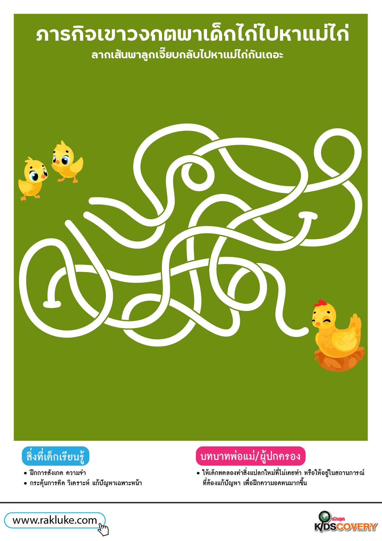 - ลากเส้นในเขาวงกตเพื่อพาเด็กไก่กลับไปหาแม่ไก่