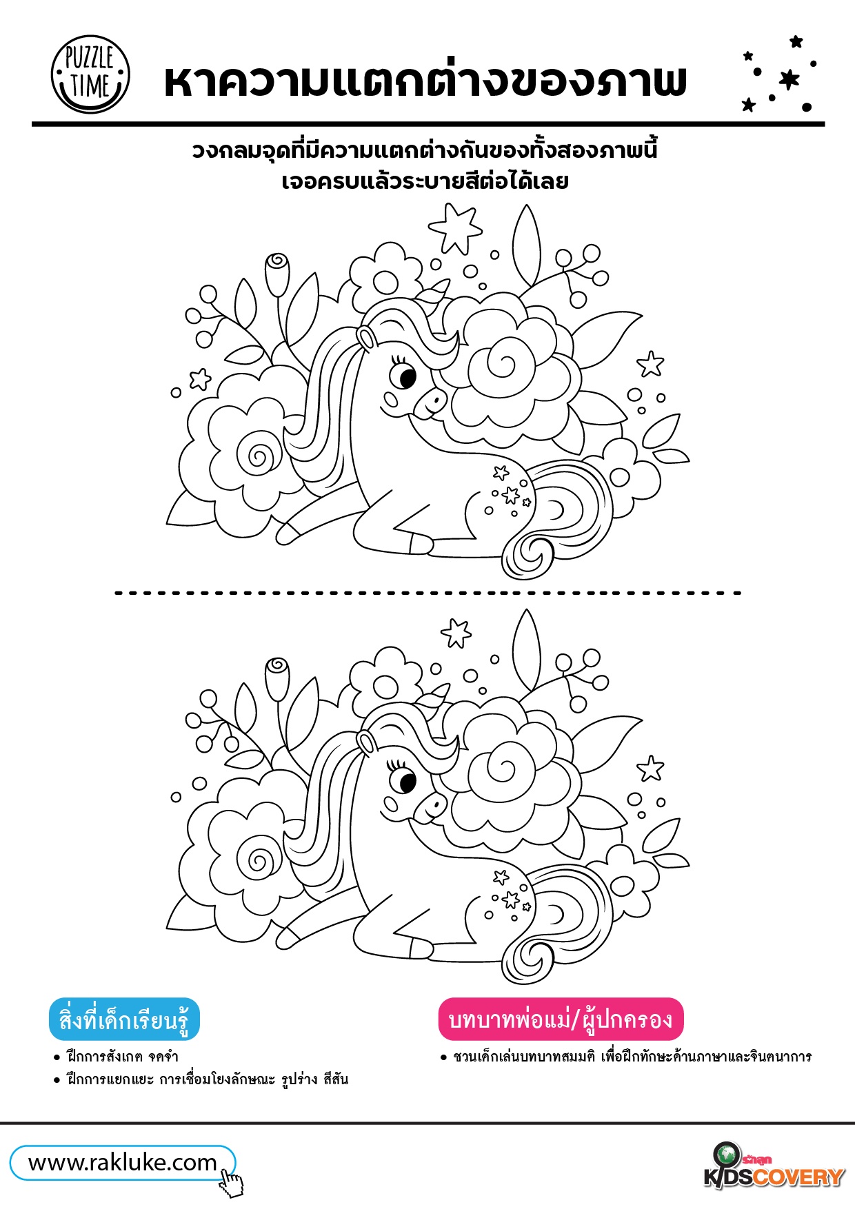 เกมหาความต่างในภาพ หาความแตกต่างของยูนิคอร์น - ดาวน์โหลดฟรี Learning Sheet