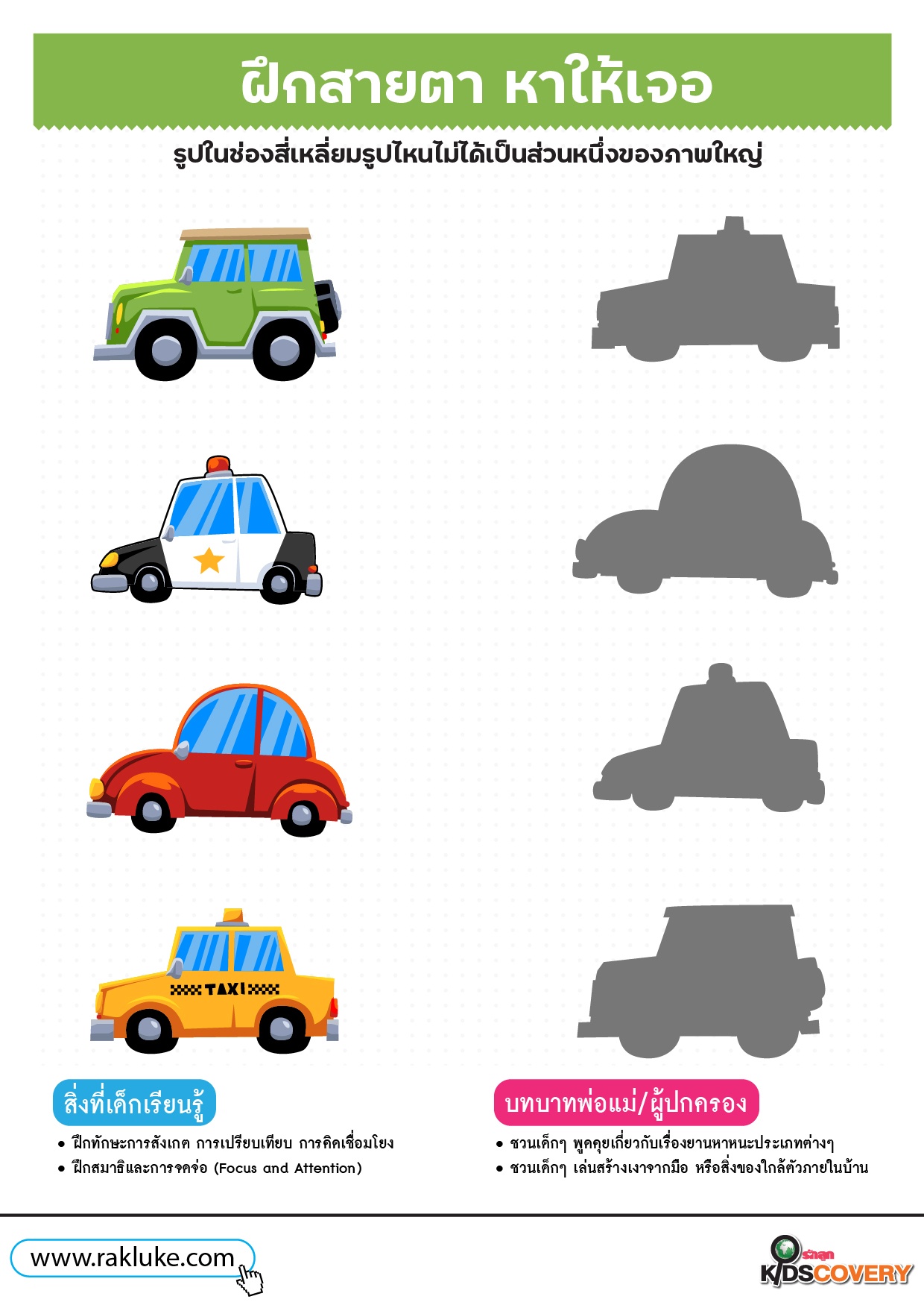 เกมจับคู่เงา ลากเส้นรถให้ถูกต้องนะเด็ก ๆ - ดาวน์โหลด Learning Sheet