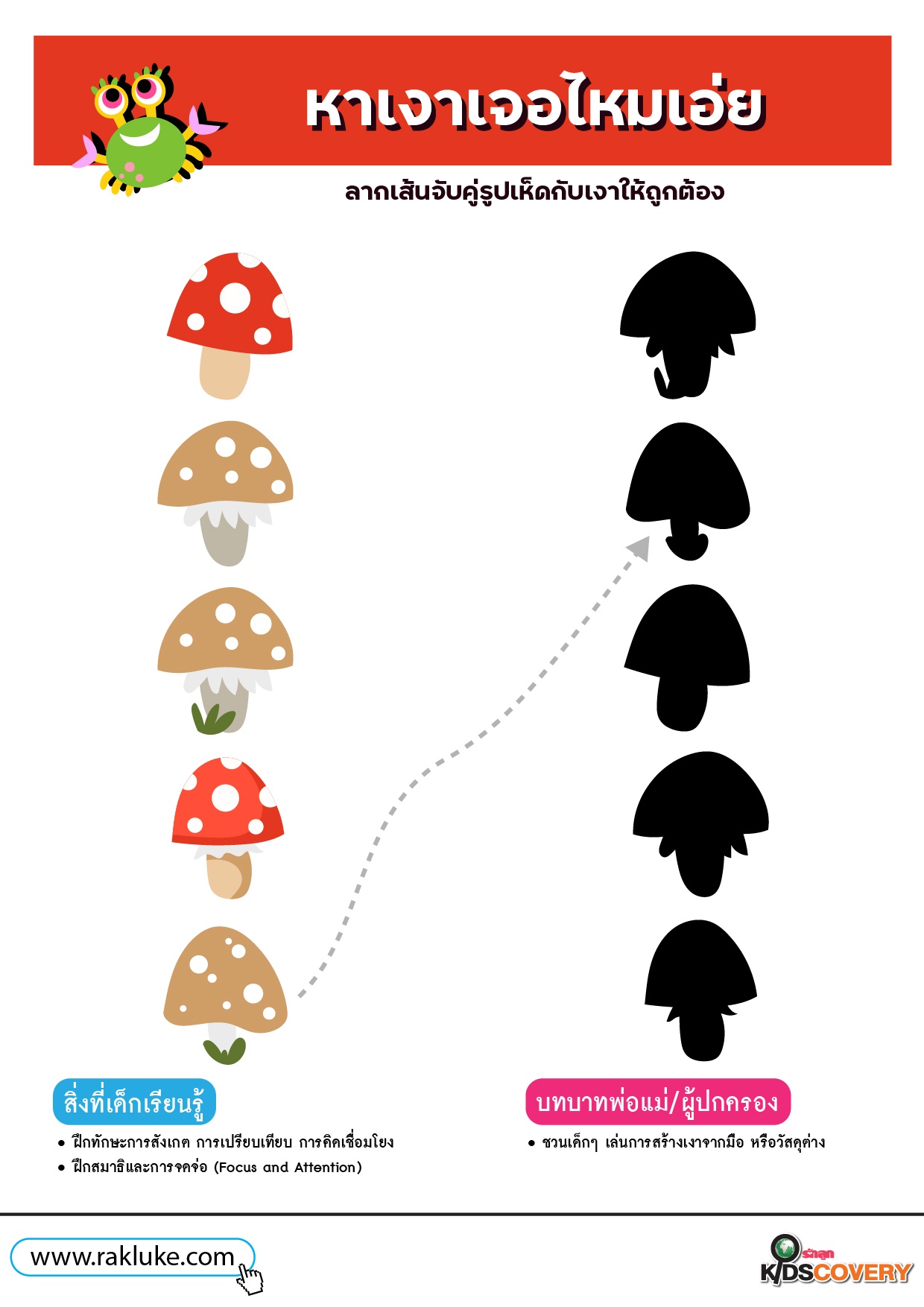 เกมจับคู่เงา รูปทรง ลากเส้นเห็ดทั้ง 5 ดอก - ดาวน์โหลด Learning Sheet