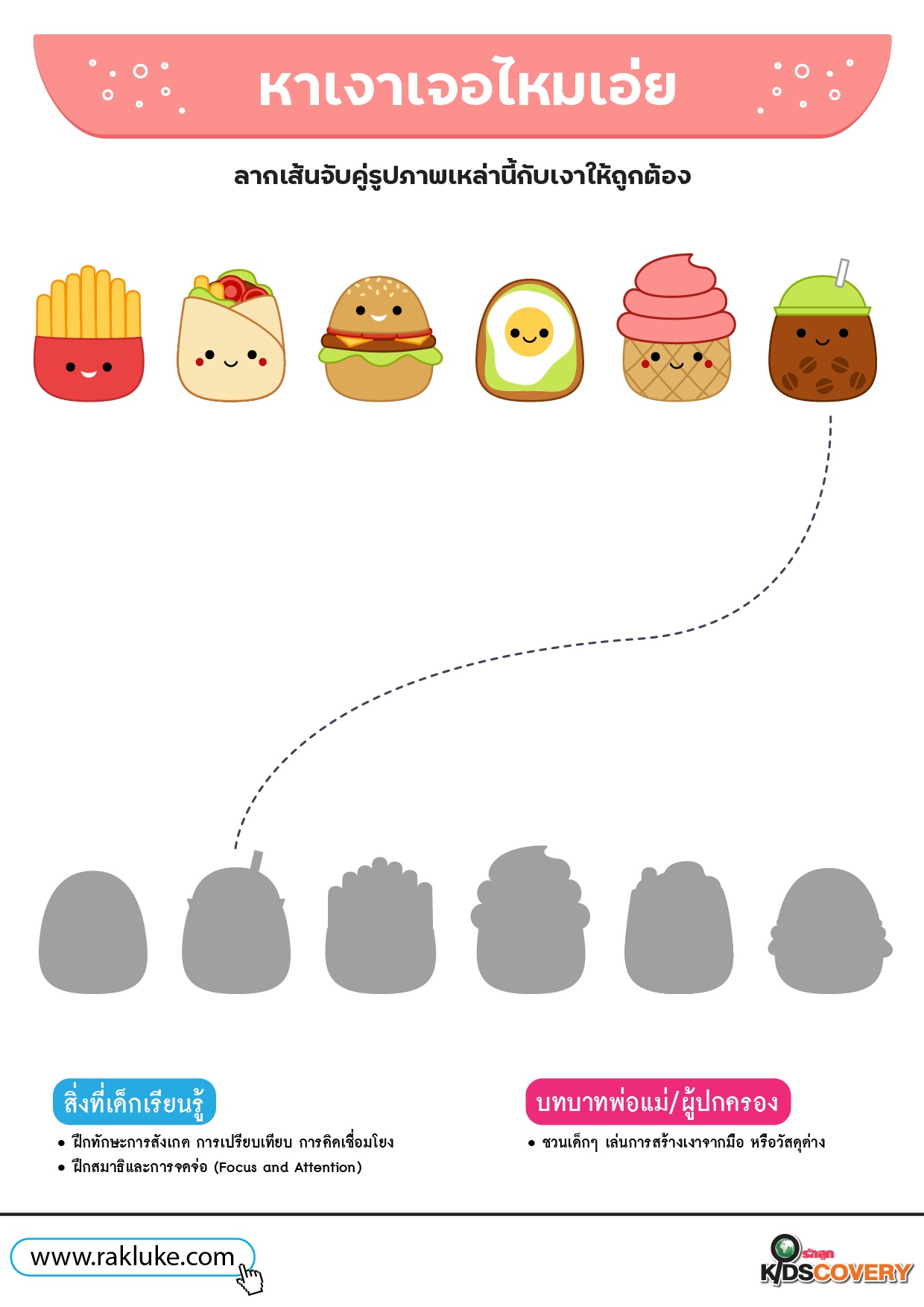 เกมจับคู่เงา รูปทรง ลากเส้นของว่างน่าอร่อยกันเถอะ - ดาวน์โหลด Learning Sheet