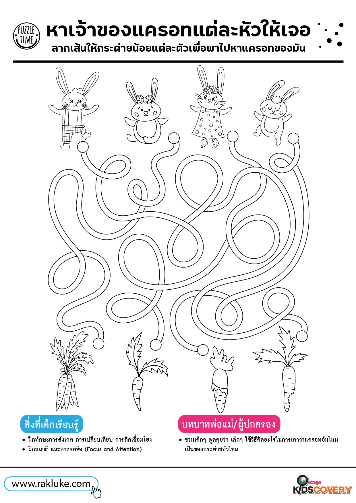- สามารถเพิ่มความสนุกได้ โดยให้เด็กๆ ลองเดาว่าแครอทหัวไหนเป็นของกระต่ายตัวไหน แล้วจึงลากเส้น