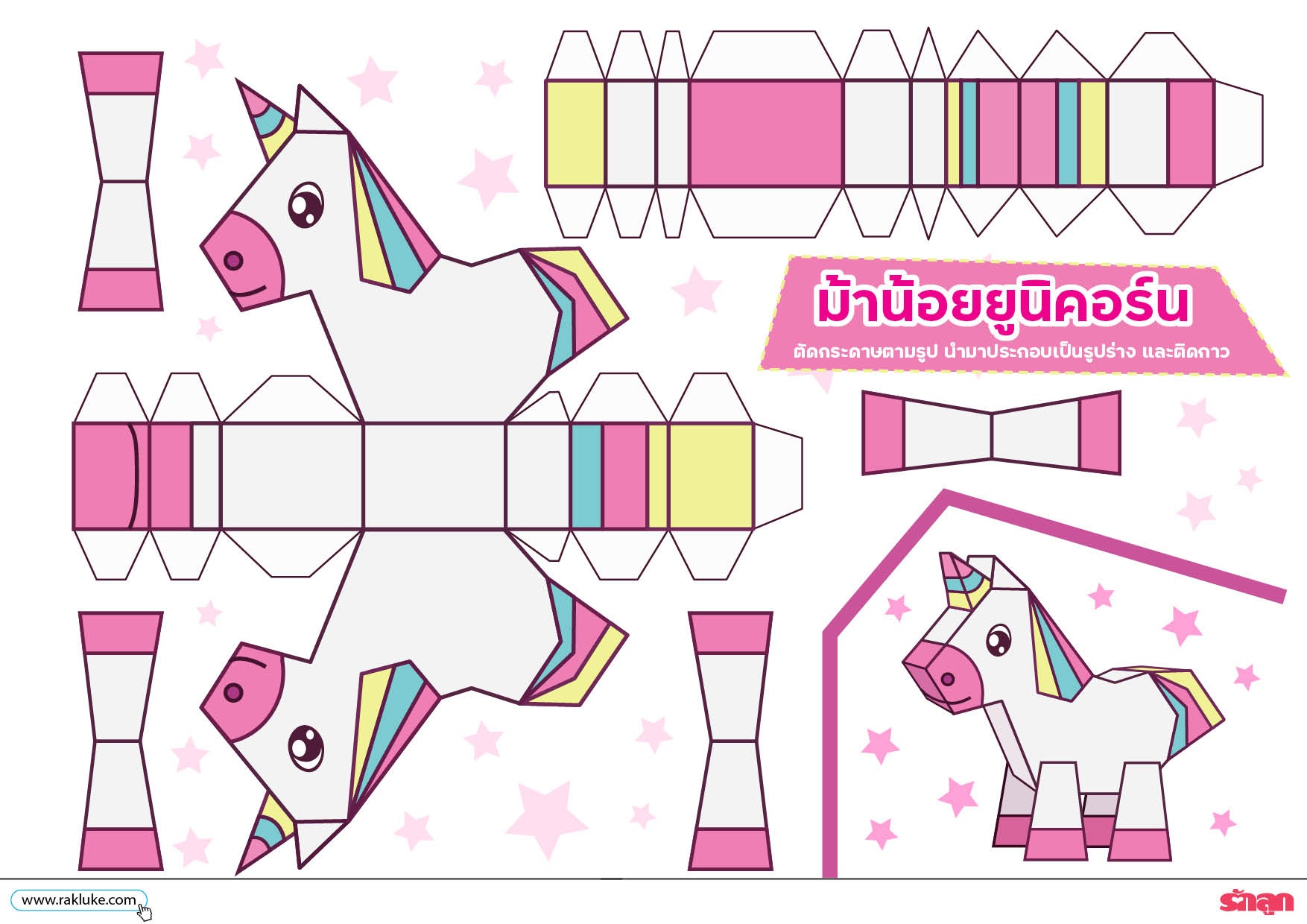 วิธีเล่นตุ๊กตากระดาษม้าน้อยยูนิคอร์น: ดาวน์โหลดไฟล์ภาพ และ ปริ้นท์ออกมาตัดกระดาษตามรูป นำมาประกอบเป็นรูปร่าง และติดกาว