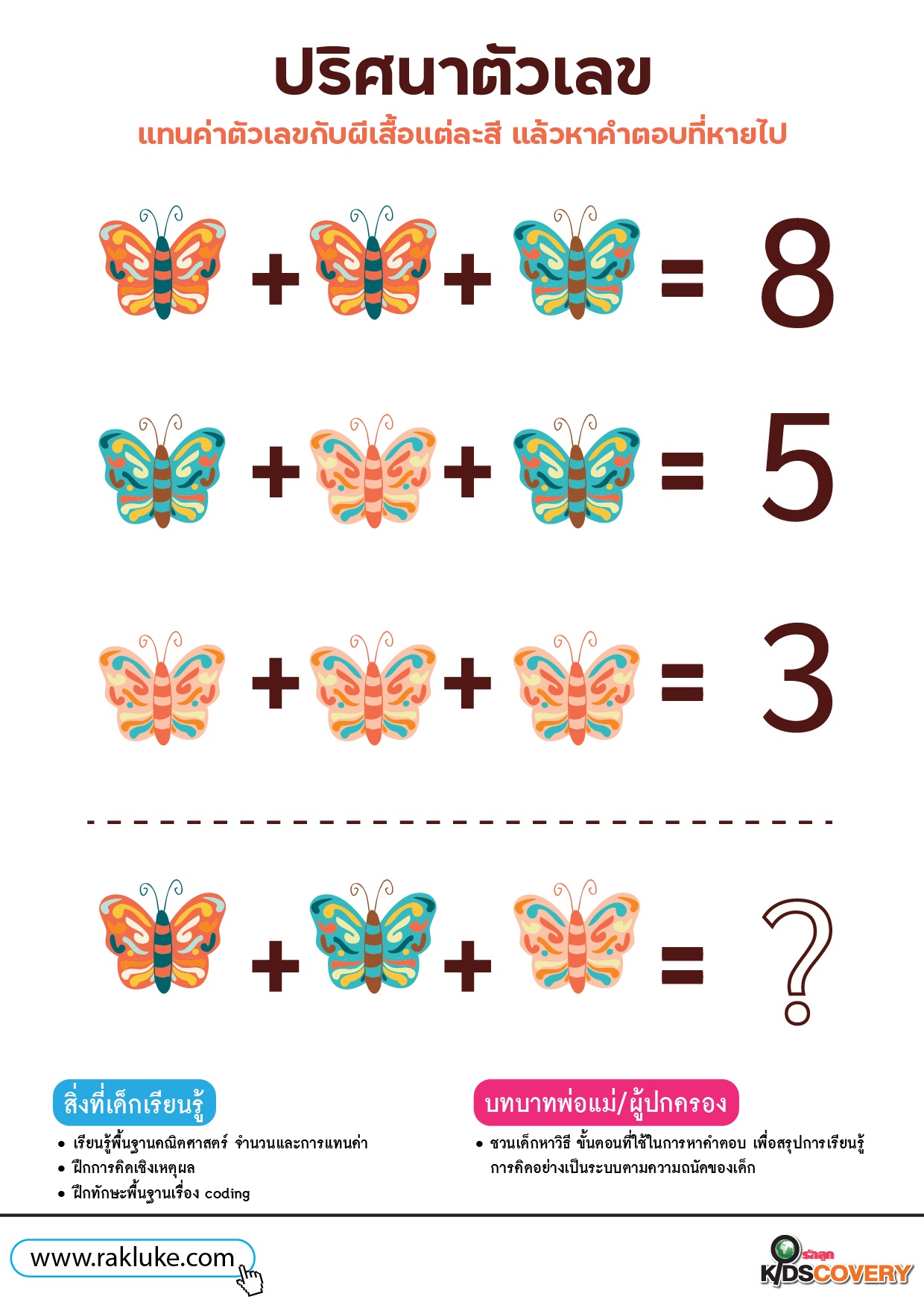 - แทนค่าตัวเลขกับสัญลักษณ์ผีเสื้อแต่ละแบบ ที่นำมาบวกกันแล้วได้จำนวนถูกต้อง แล้วหาคำตอบของปริศนาตัวเลขที่เว้นว่างไว้