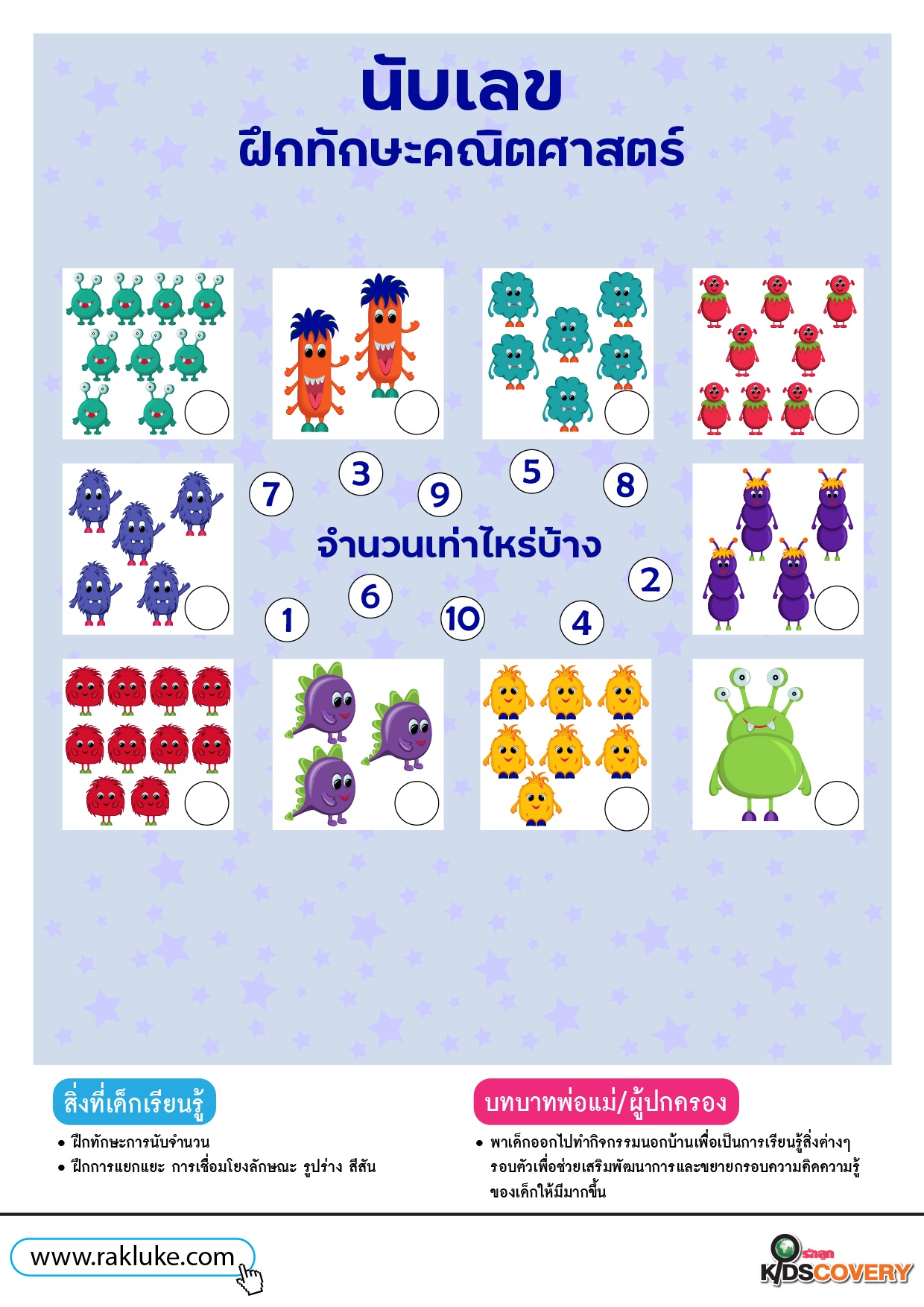 เกมนับเลขมนุษย์ต่างดาว นับเลขฝึกทักษะคณิตศาสตร์ 1 - ดาวน์โหลดฟรี Learning Sheet