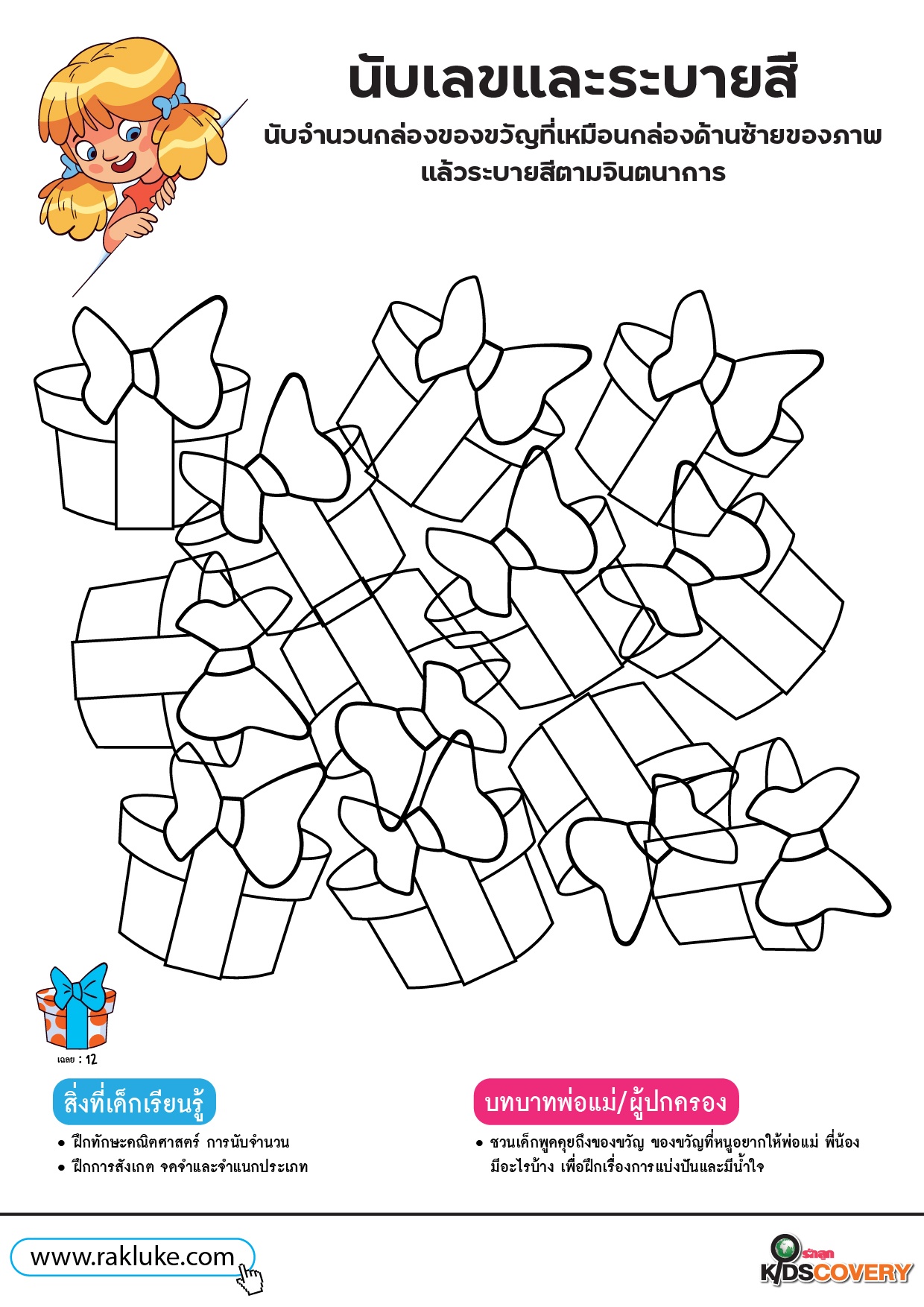 เกมนับเลข ระบายสีกล่องของขวัญ - ดาวน์โหลดฟรี Learning Sheet