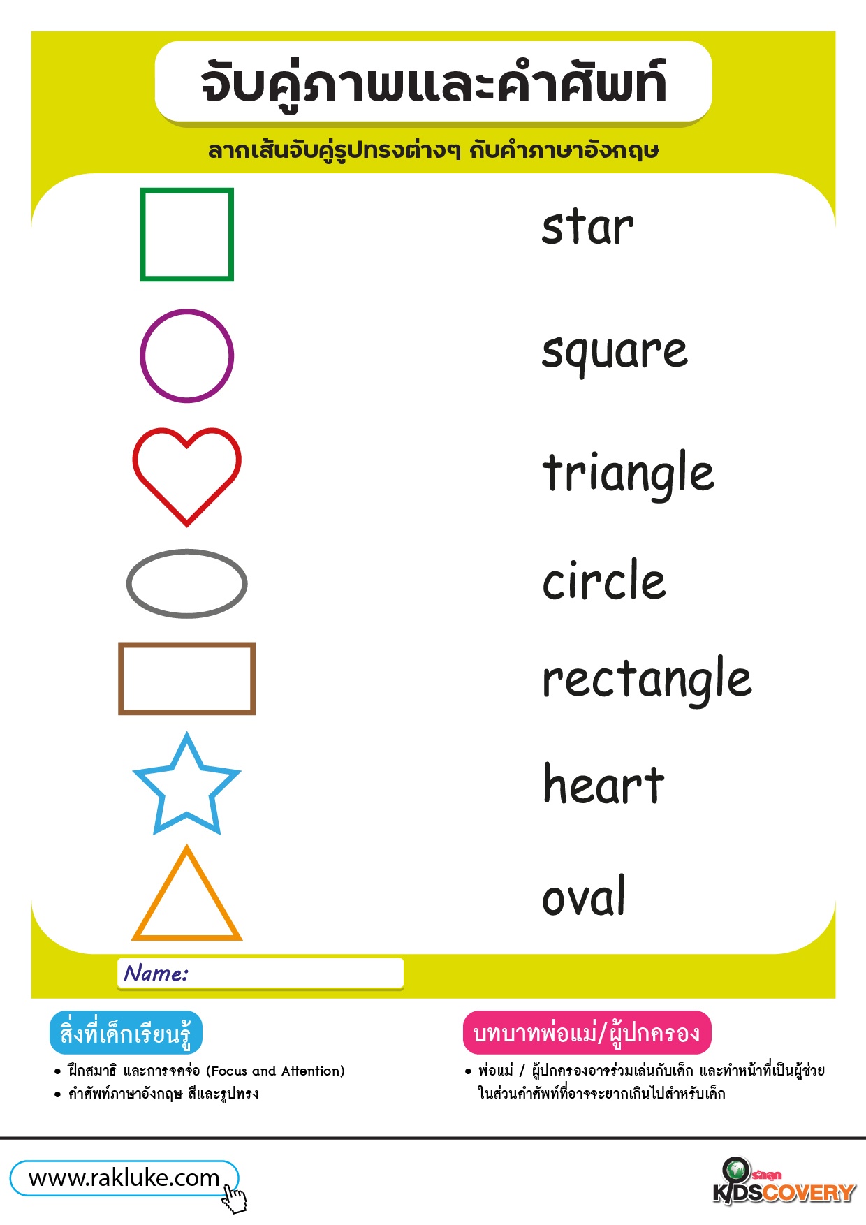 เกมจับคู่รูปทรง และฝึกคำศัพท์ภาษาอังกฤษ - ดาวน์โหลด Learning Sheet