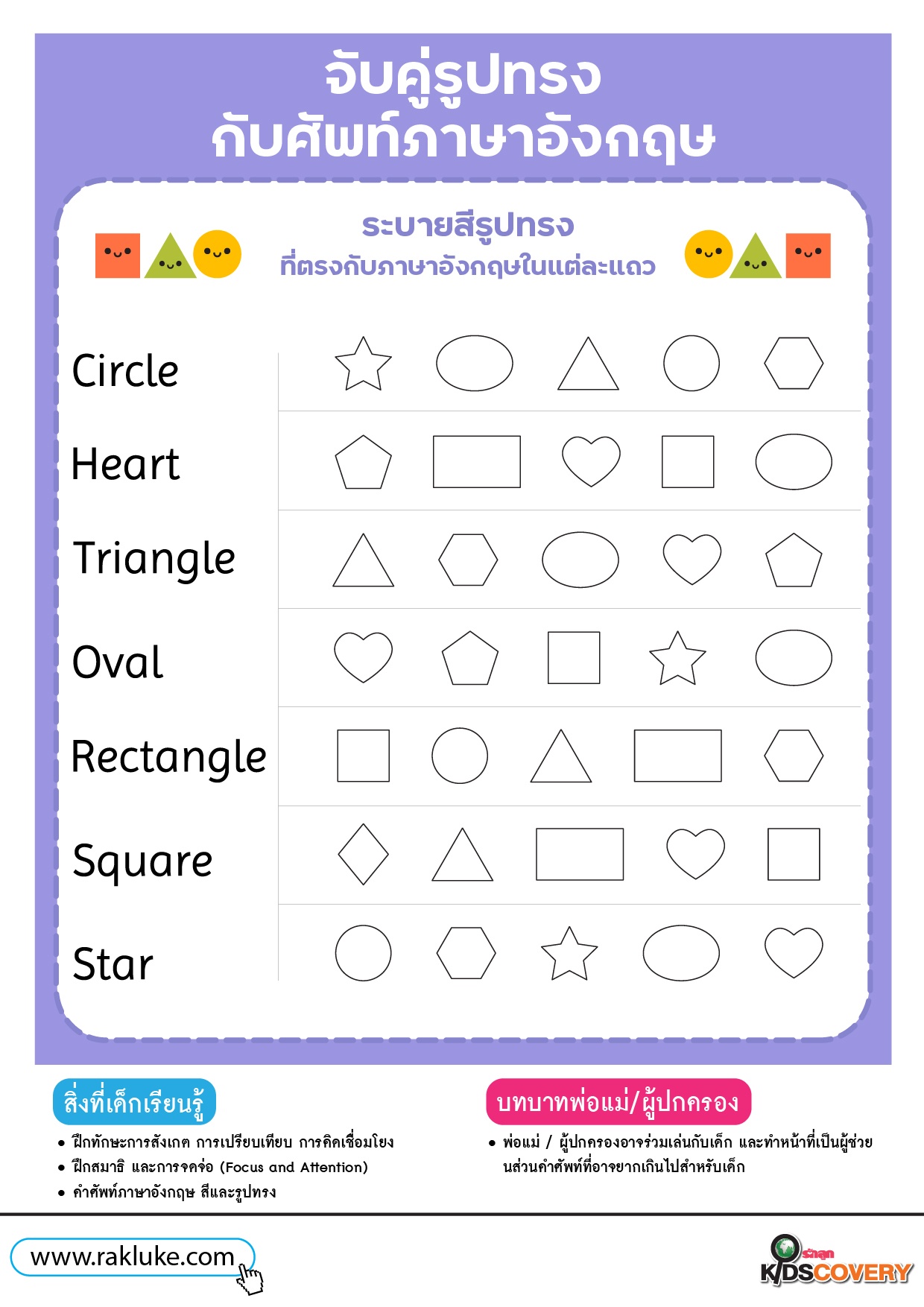 เกมจับคู่รูปทรง ระบายสี และฝึกคำศัพท์ภาษาอังกฤษ - ดาวน์โหลด Learning Sheet