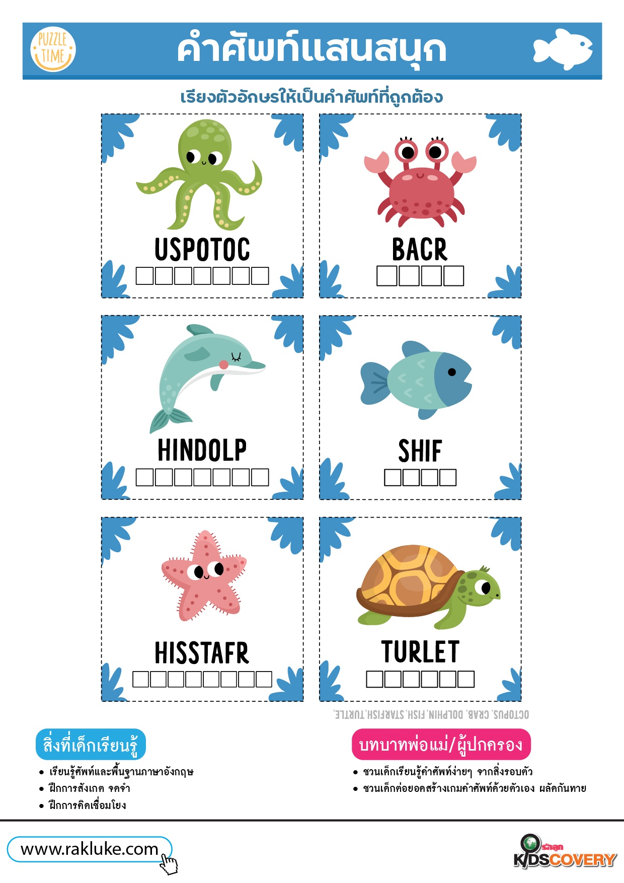 วิธีเล่น: ดูรูปภาพและตัวอักษรในภาพ เขียนเรียงตัวอักษรใหม่ให้เป็นคำศัพท์ที่ถูกต้อง