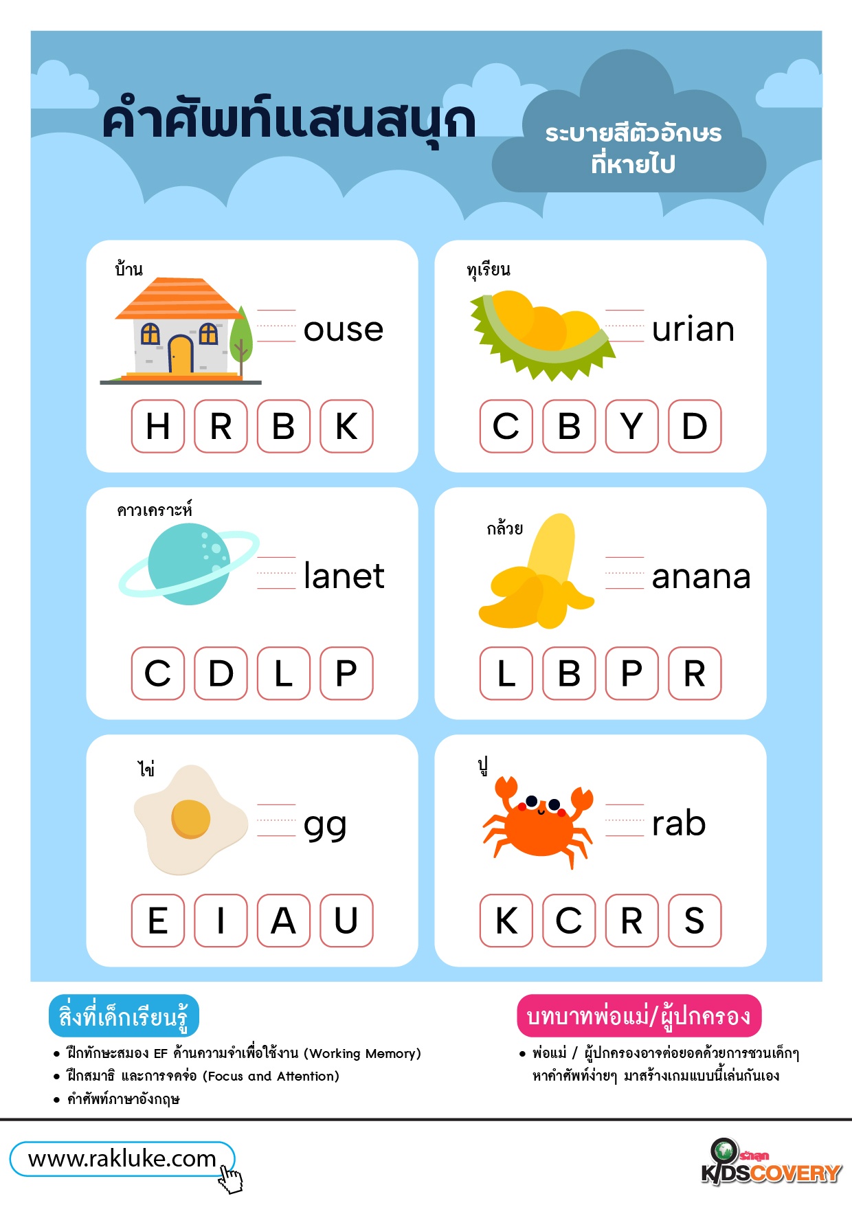 - พ่อแม่ / ผู้ปกครองอาจต่อยอดด้วยการชวนเด็ก ๆ หาคำศัพท์ง่าย ๆ มาสร้างเกมแบบนี้เล่นกันเอง