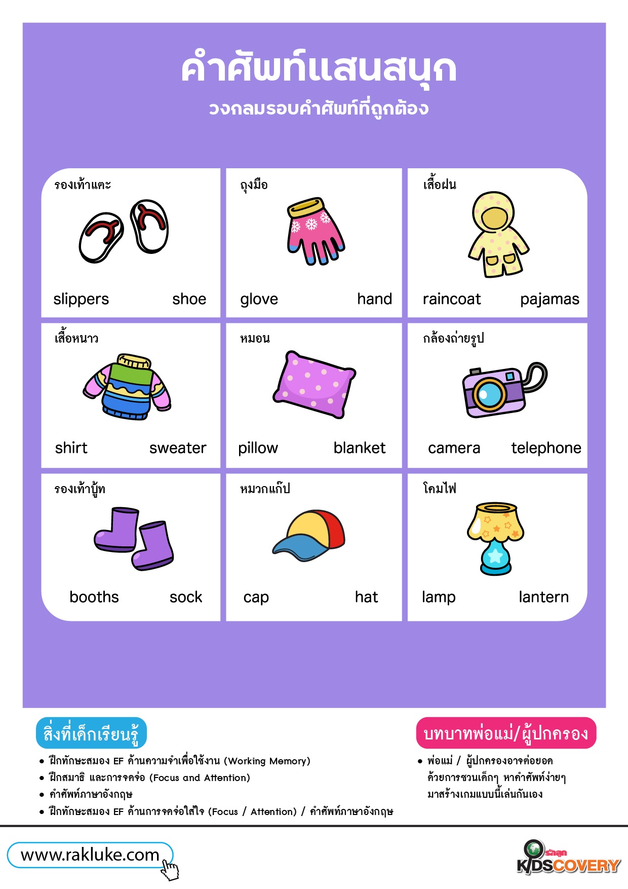 เกมสอนคำศัพท์เสื้อผ้าและสิ่งของ - ดาวน์โหลด Learning Sheet