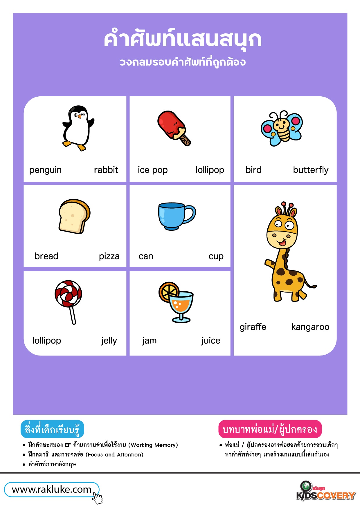 - พ่อแม่ / ผู้ปกครองอาจต่อยอดด้วยการชวนเด็ก ๆ หาคำศัพท์ง่าย ๆ มาสร้างเกมแบบนี้เล่นกันเอง