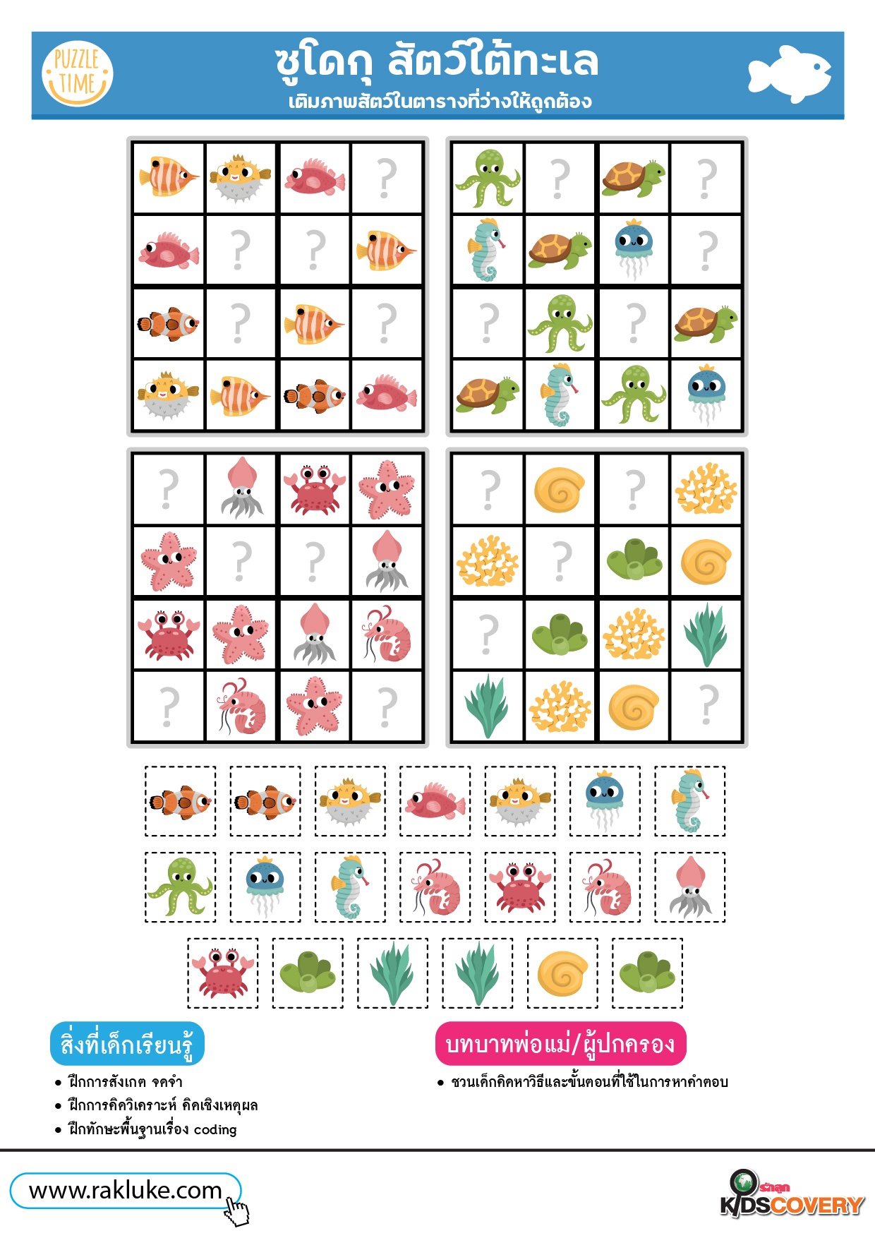 เกมซูโดกุ สัตว์ใต้ทะเล - ดาวน์โหลดฟรี Learning Sheet