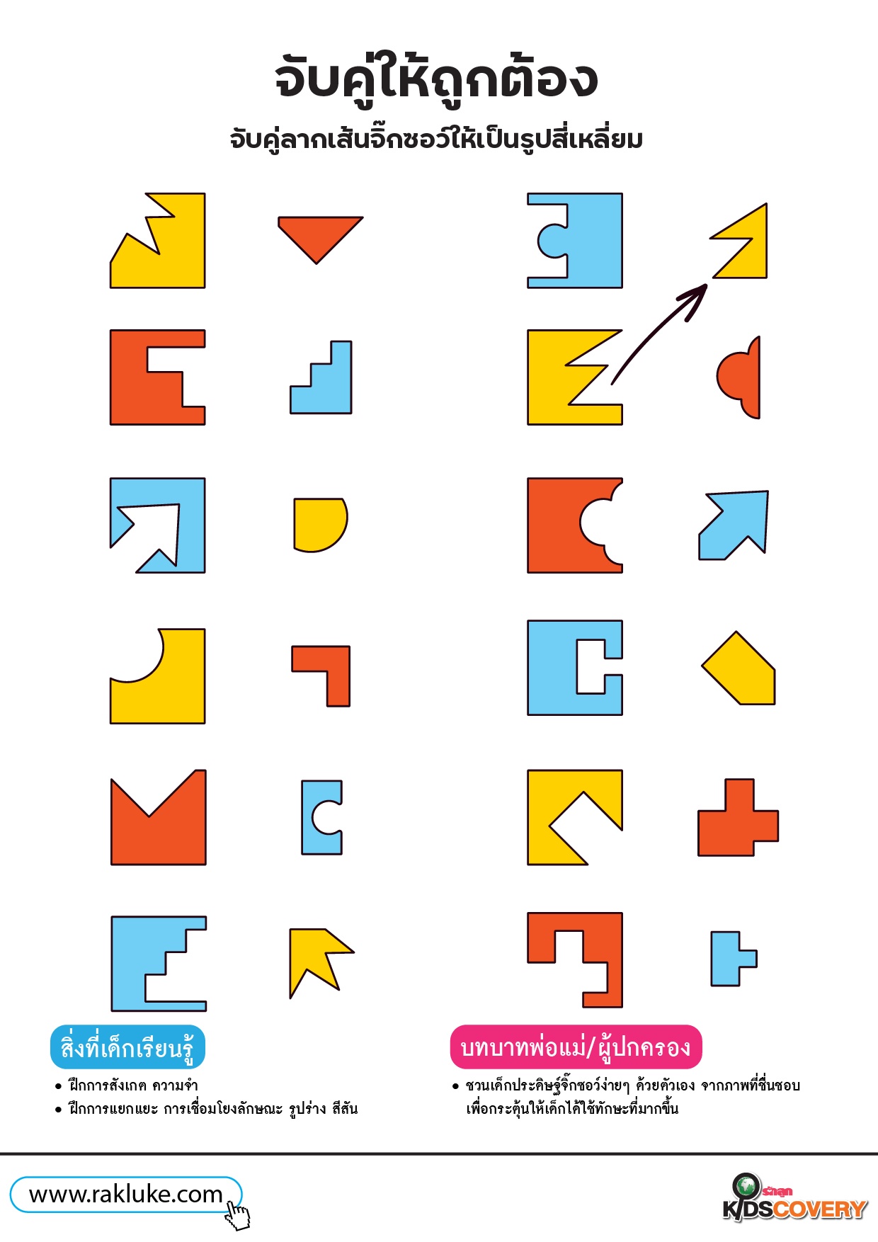 - จับคู่และลากเส้นต่อจิ๊กซอว์แต่ละชิ้นส่วนให้ถูกต้อง โดยภาพที่สมบูรณ์ต้องเป็นรูปสี่เหลี่ยม