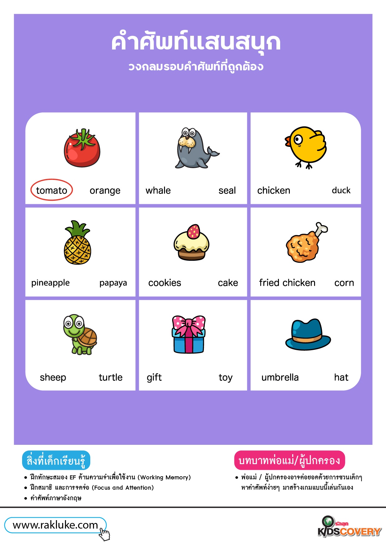 เกมสอนคำศัพท์ผลไม้ ขนม สัตว์ สิ่งของ - ดาวน์โหลด Learning Sheet