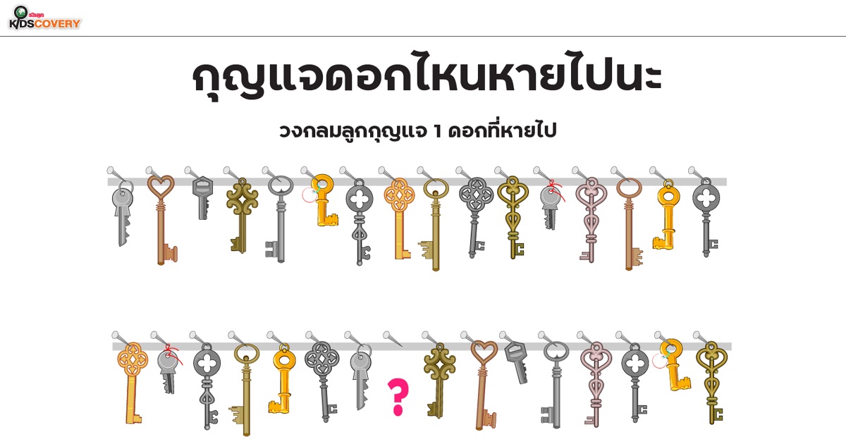 วิธีเล่น: ลากเส้นจับคู่ลูกกุญแจที่เหมือนกัน ลูกกุญแจที่ไม่มีคู่จะเหลืออยู่ 1 ดอก คือลูกกุญแจในแถวล่างที่หายไป