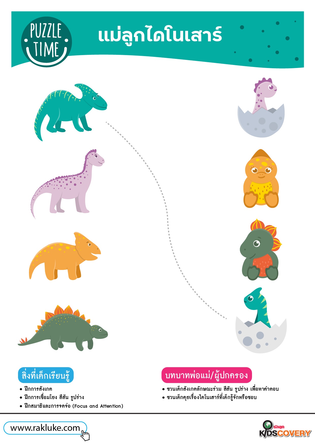 วิธีเล่น: สังเกตไดโนเสาร์ที่มีลักษณะร่วมกัน และลากเส้นจับคู่แม่ลูกไดโนเสาร์