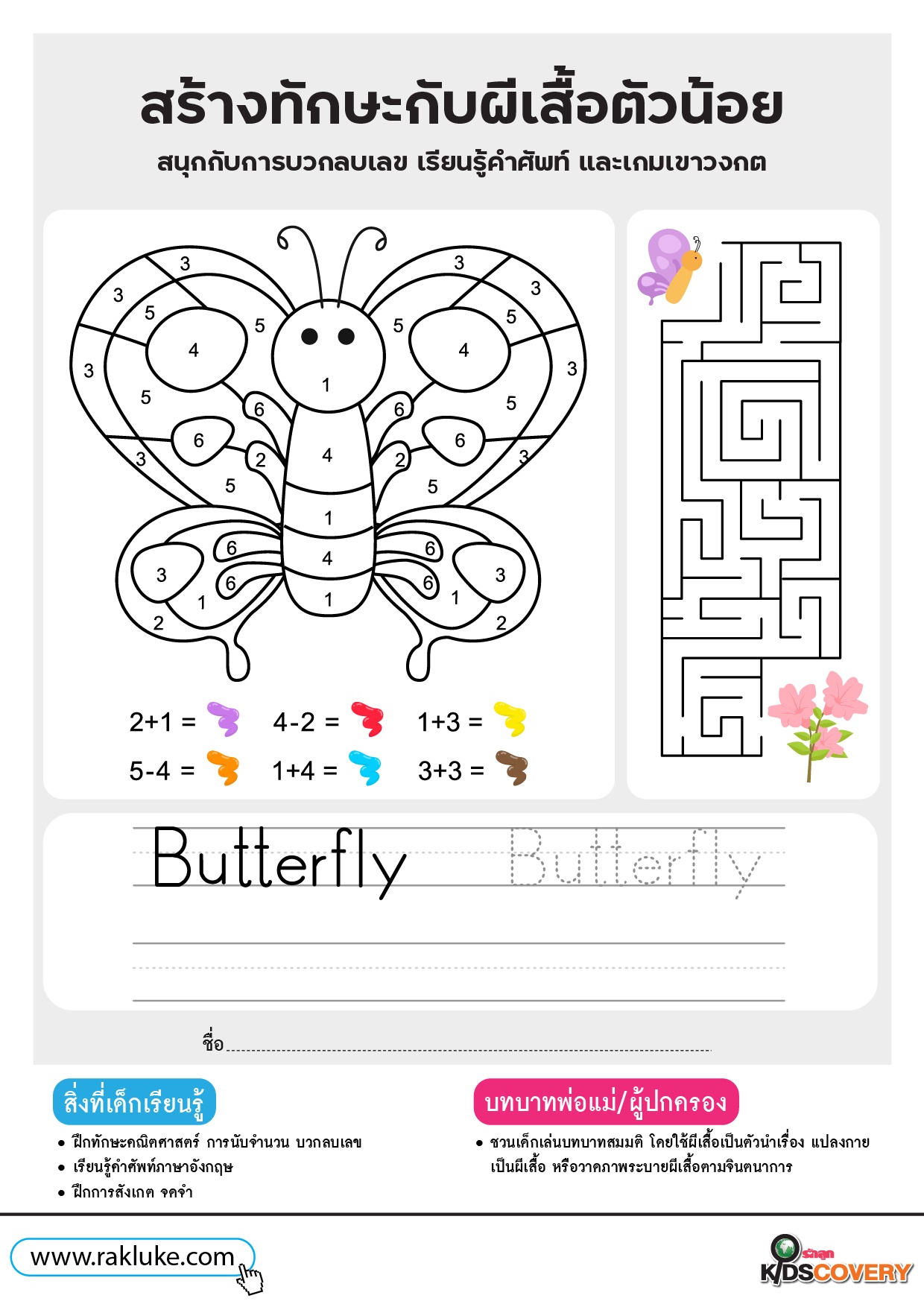 เกมนับเลข ระบายสี สร้างทักษะกับผีเสื้อตัวน้อย - ดาวน์โหลดฟรี Learning Sheet