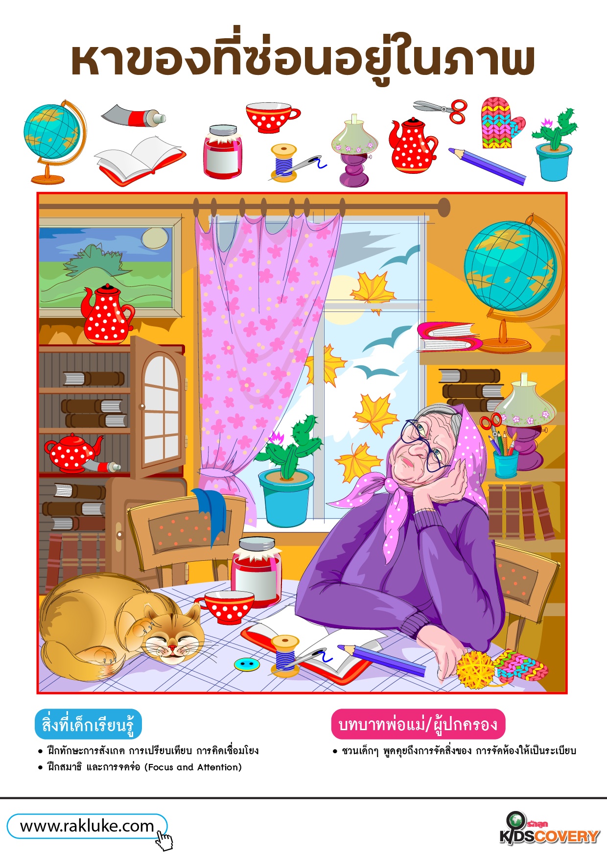 คุณยายแก่แล้วสายตาไม่ดี มาช่วยคุณยายหาของ 12 ชิ้นให้เจอ - ดาวน์โหลด Learning Sheet