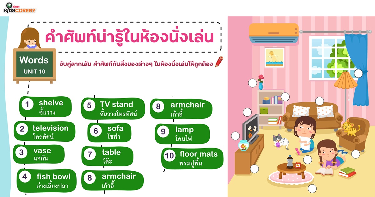 - จับคู่ลากเส้น คำศัพท์กับสิ่งของต่าง ๆ ในห้องนั่งเล่นให้ถูกต้อง